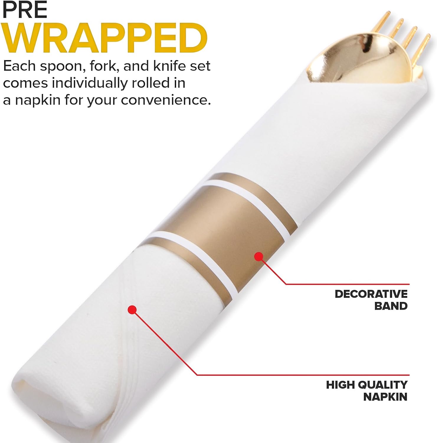 • Pre-rolled Convenience: As the perfect pre wrapped silverware set disposable, you don't even have to worry about buying napkins. Our pre rolled silverware disposable, paired with these pre-rolled napkins, makes your event a breeze.