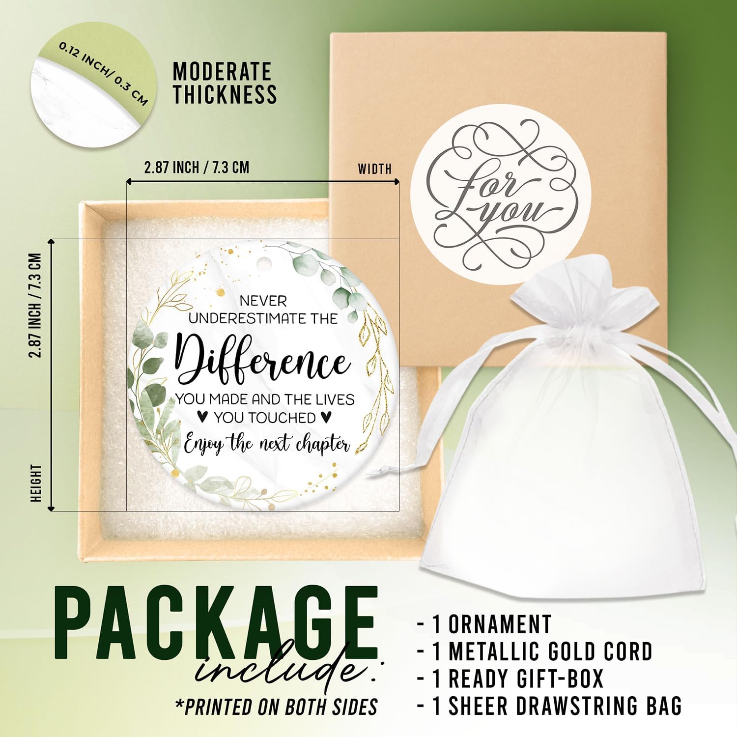 • THOUGHTFUL PACKAGE: Our Ornament comes complete with 1 Two-Sided Ornament, 1 Metallic Gold Cord for easy hanging, 1 Sheer Organza Bag and 1 Gift Box, all meticulously crafted. The two-sided design and attached metallic Gold Cord make it a breeze to hang anywhere from any angle, be it in a classroom or your home. Rest assured, the high-quality brown cardboard box ensures the ornament remains well-protected during transit, avoiding any damage
