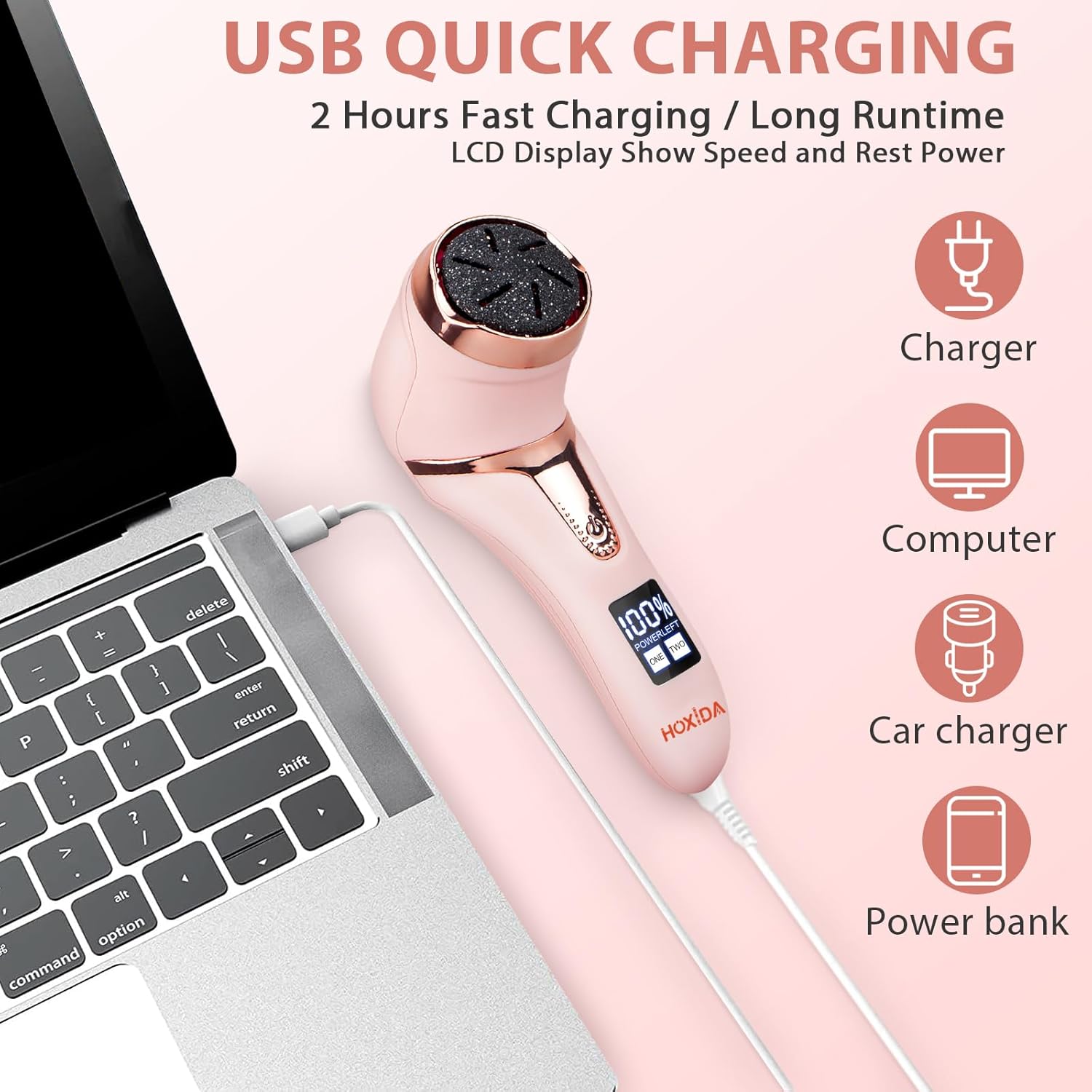 • Rechargeable, Long-Lasting, Easy to Use ----Included USB charging cable, This electric foot file can be charged via any USB port, and have a long runtime 2hours after full charged .and this dead skin remover for feet have LCD Power display let you clear know the rest power it left. remind you charge in time