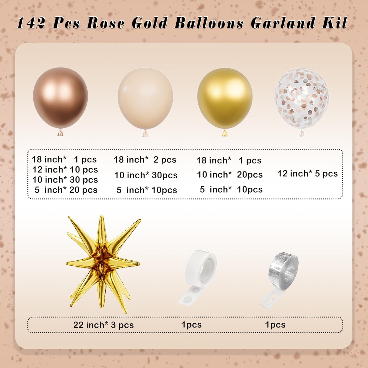 Rose Gold Garland Arch Kit, 142PCS Macaron Orange Confetti Latex Metal Aluminum Foil Balloons for Baby Shower, Ladies Birthday, Wedding Party Decor Supplies