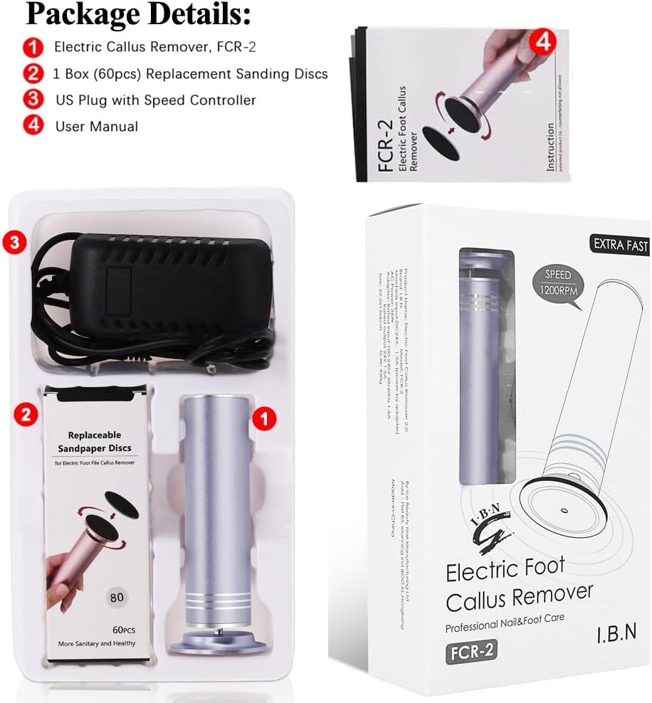 • Package Details: 1 x upgraded electric heel callus remover 1200 rpm, 1 x box of 60-pack sandpaper, 1 x US socket, 1 x instruction manual. Please note that the machine is not waterproof.