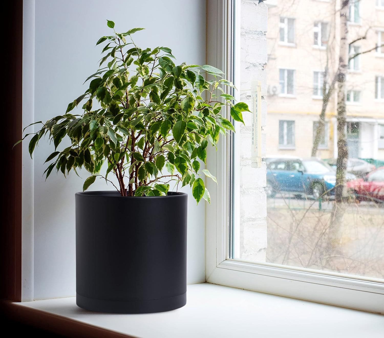 D'vine Dev 2 Pack 10 Inch Modern Plastic Plant Pots, Cylindrical Garden Planters for Plants with Drainage Holes and Saucers, Black, 74-Y-N-1