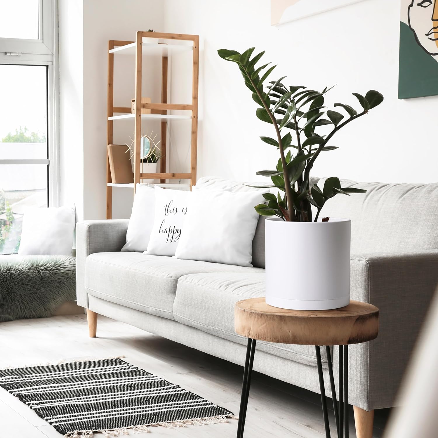 D'vine Dev 2 Pack 10 Inch Modern Plastic Plant Pots, Cylindrical Garden Planters for Plants with Drainage Holes and Saucers, White, 74-Z-N-1