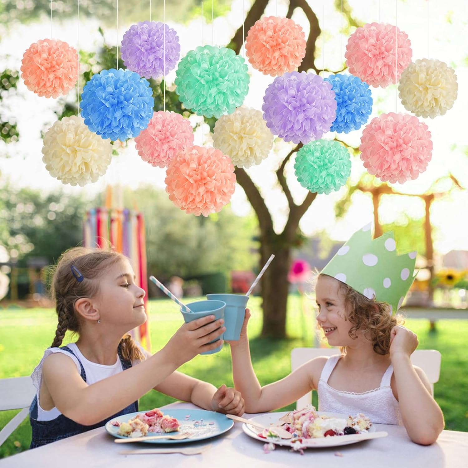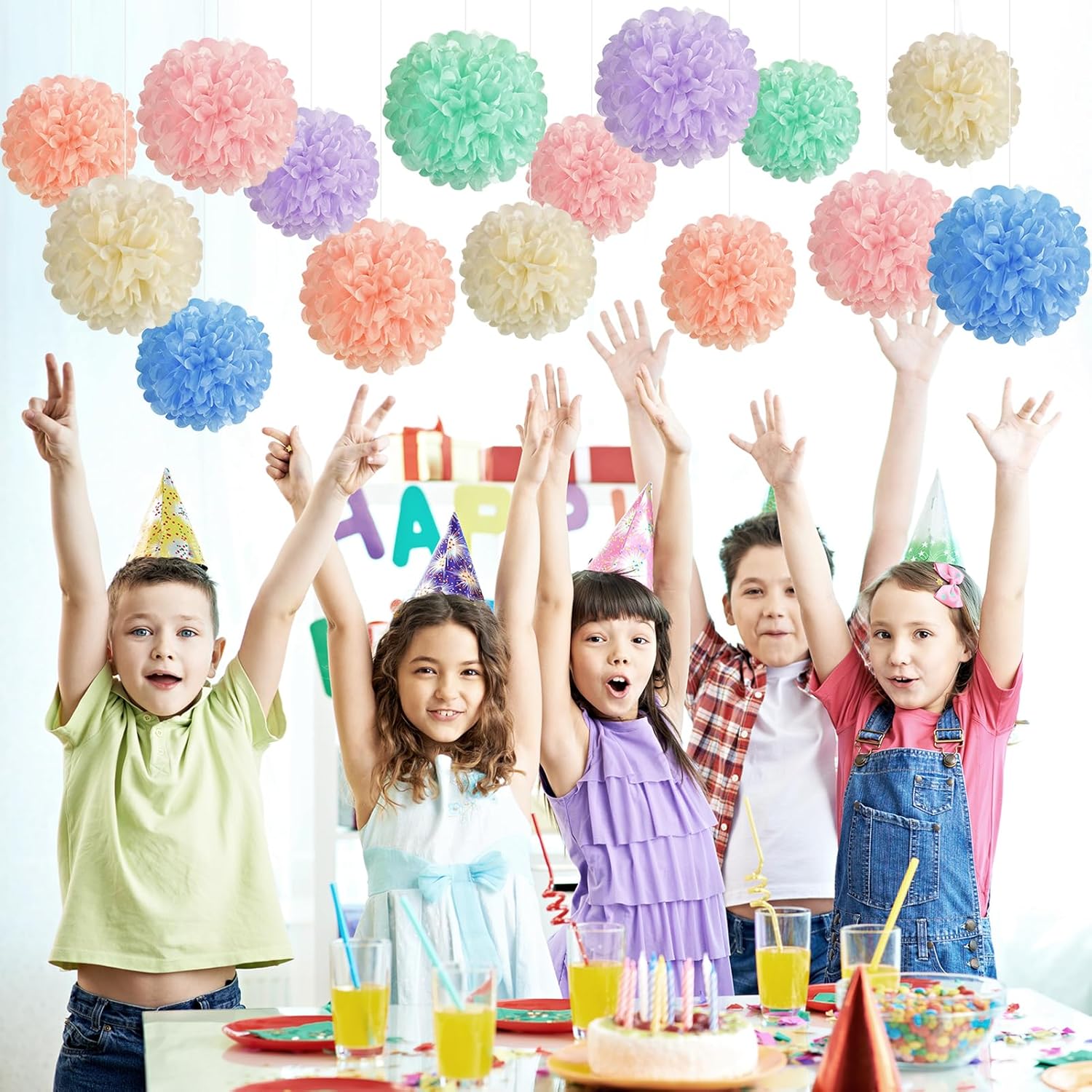 • Colorful Pastel Tissue Pom Poms Decoration: The 15PCS Pastel Paper Tissue Pom Poms include various soft pastel shades, creating a cheerful and sweet atmosphere for any occasion.
