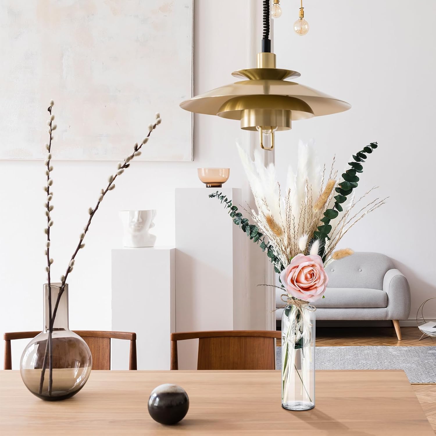 • Quality Material: our pampas grass is beautifully textured and warm in color, which will become more fluffy and supple after a few hours in the sun; Artificial roses are made of quality materials and have natural colors, giving your space a natural appearance; Made of quality glass, the glass vases are safe and clear, and the linen rope is reliable and durable