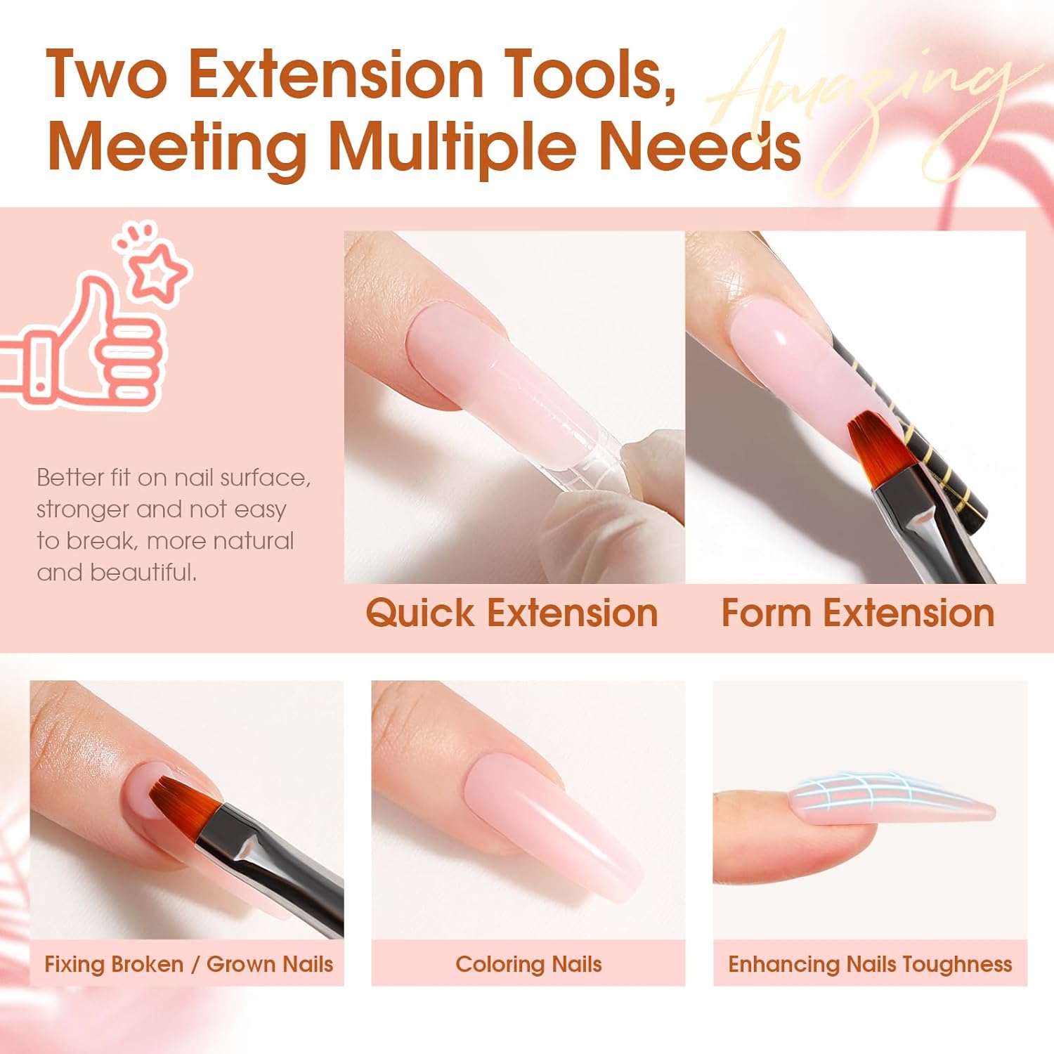 • A warm reminder: It is common for gels to be sticky. so dipping you brush into the gel solution will help you push the gel more smoothly. Or you can seal the gel tube and soak it in warm water before use, which will make it more fluid and help you squeeze out the poly nai gel more smoothly. Both sides of the nail need LED light or UV light to cure for about 120s to completely dry. The lighting time needed depends on the thickness of the gel.