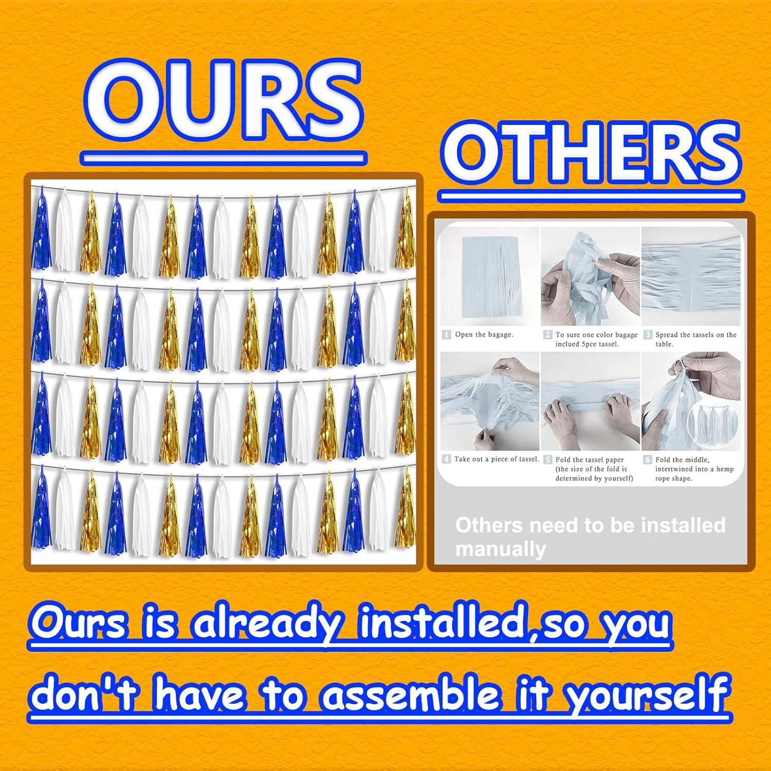 • 【Package Includes】The total length of the navy blue white gold birthday tassels banner is 40 feet, divided into 4 strips, each 10 feet long. Each banner contains 15 tassels, and each tassel measures 14 inches, for birthday decorations many occasions uitable for Patriotic display, Homecoming Float, Christmas Float, ecorative metal trailers, graduation floats etc