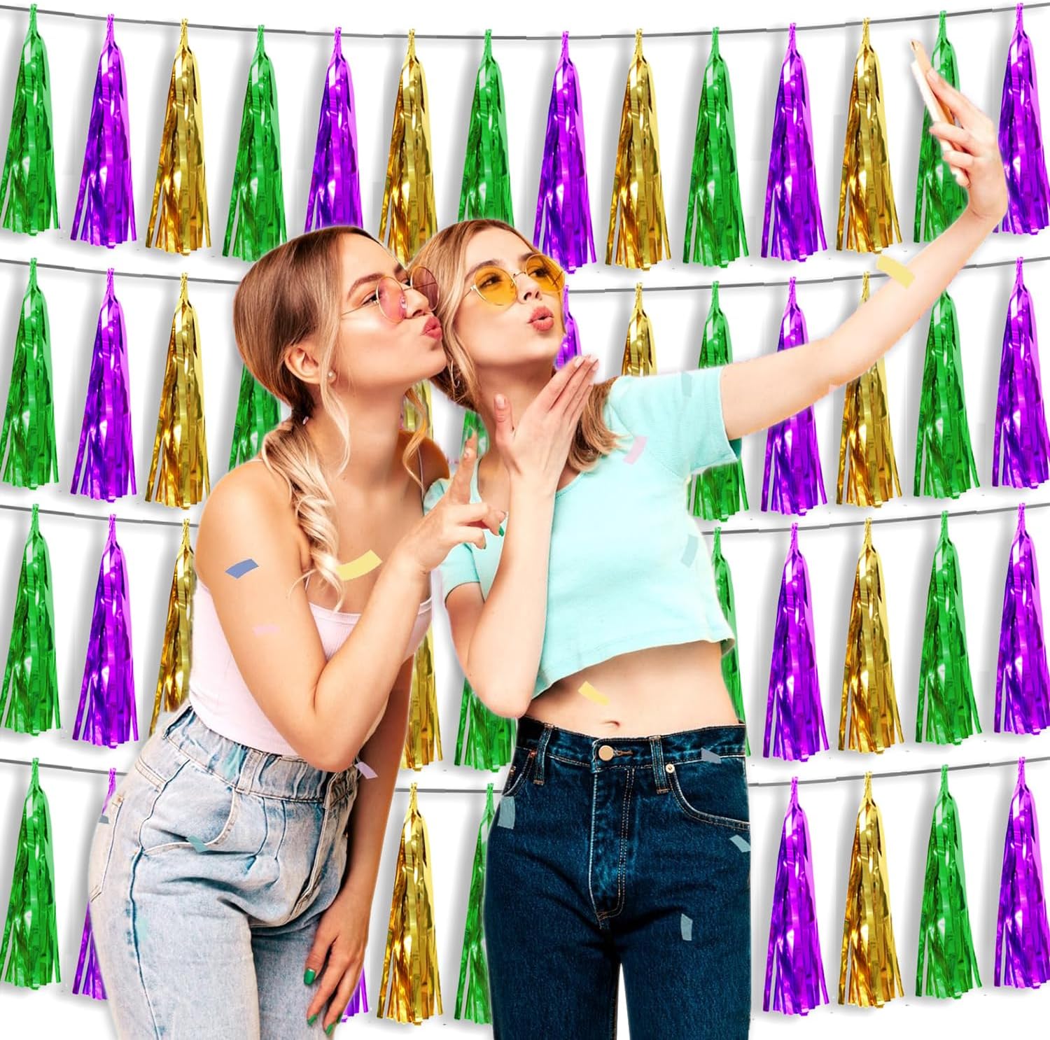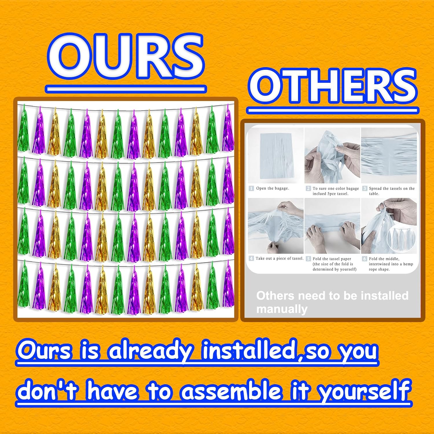 • 【Package Includes】The total length of the gold green purple gold birthday tassels banner is 40 feet, divided into 4 strips, each 10 feet long. Each banner contains 15 tassels, and each tassel measures 14 inches, for birthday decorations many occasions uitable for Patriotic display, Homecoming Float, Christmas Float, ecorative metal trailers, graduation floats etc