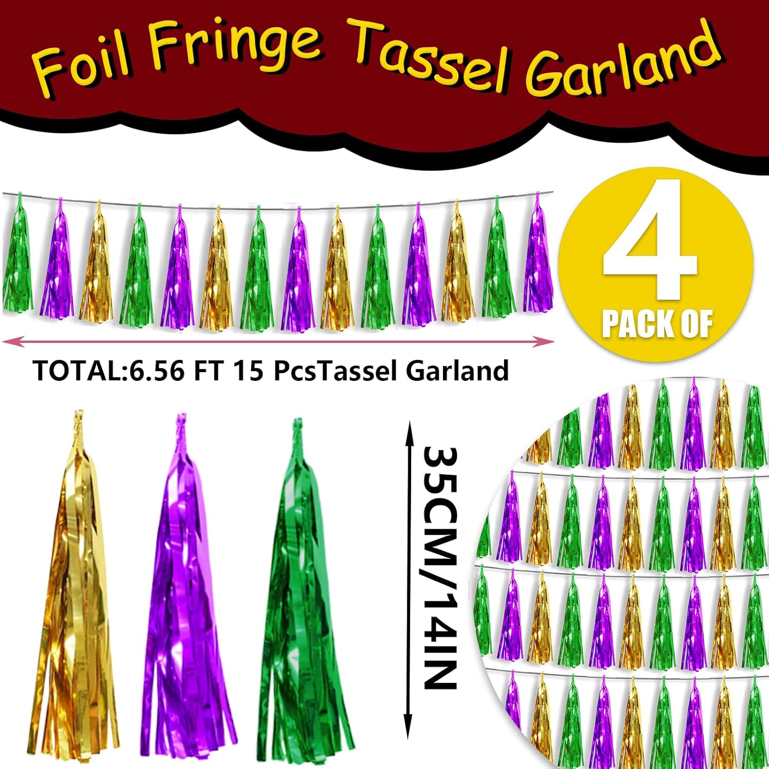 4P Gold Green Purple Foil Fringe Tassel Banner Garland Metallic Tinsel Streamers Wall Hanging Curtain Backdrop Banner for Parade Floats, Graduation 2024, Carnival Mardi Gras Party Decorations
