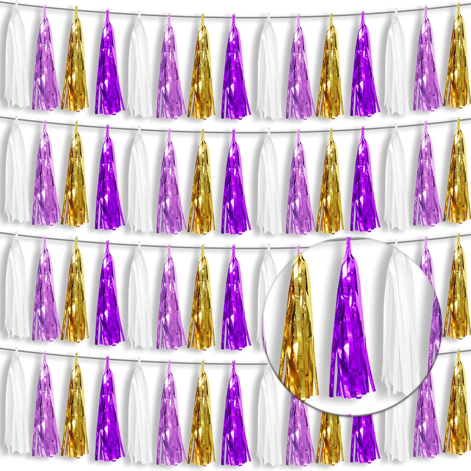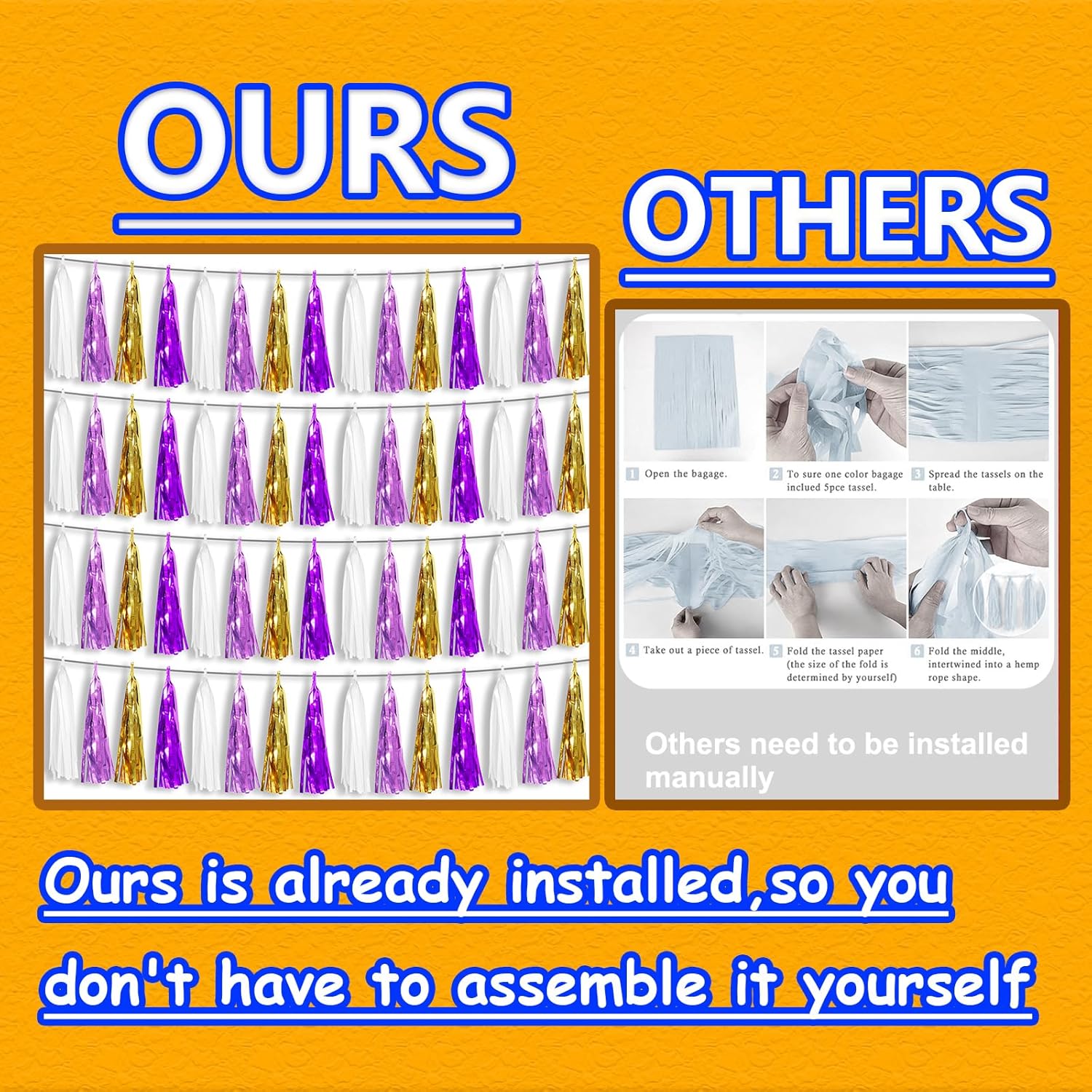 • 【Package Includes】The total length of the purple gold birthday tassels banner is 40 feet, divided into 4 strips, each 10 feet long. Each banner contains 15 tassels, and each tassel measures 14 inches, for birthday decorations many occasions uitable for Patriotic display, Homecoming Float, Christmas Float, ecorative metal trailers, graduation floats etc