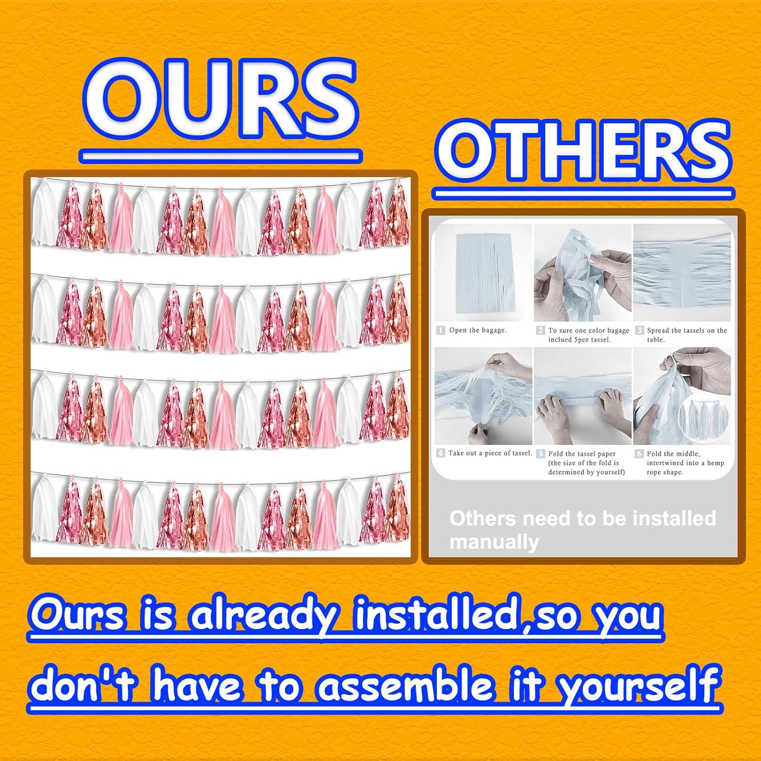 • 【Package Includes】The total length of the rose gold pink white birthday tassels banner is 40 feet, divided into 4 strips, each 10 feet long. Each banner contains 15 tassels, and each tassel measures 14 inches, for birthday decorations many occasions uitable for Patriotic display, Homecoming Float, Christmas Float, ecorative metal trailers, graduation floats etc