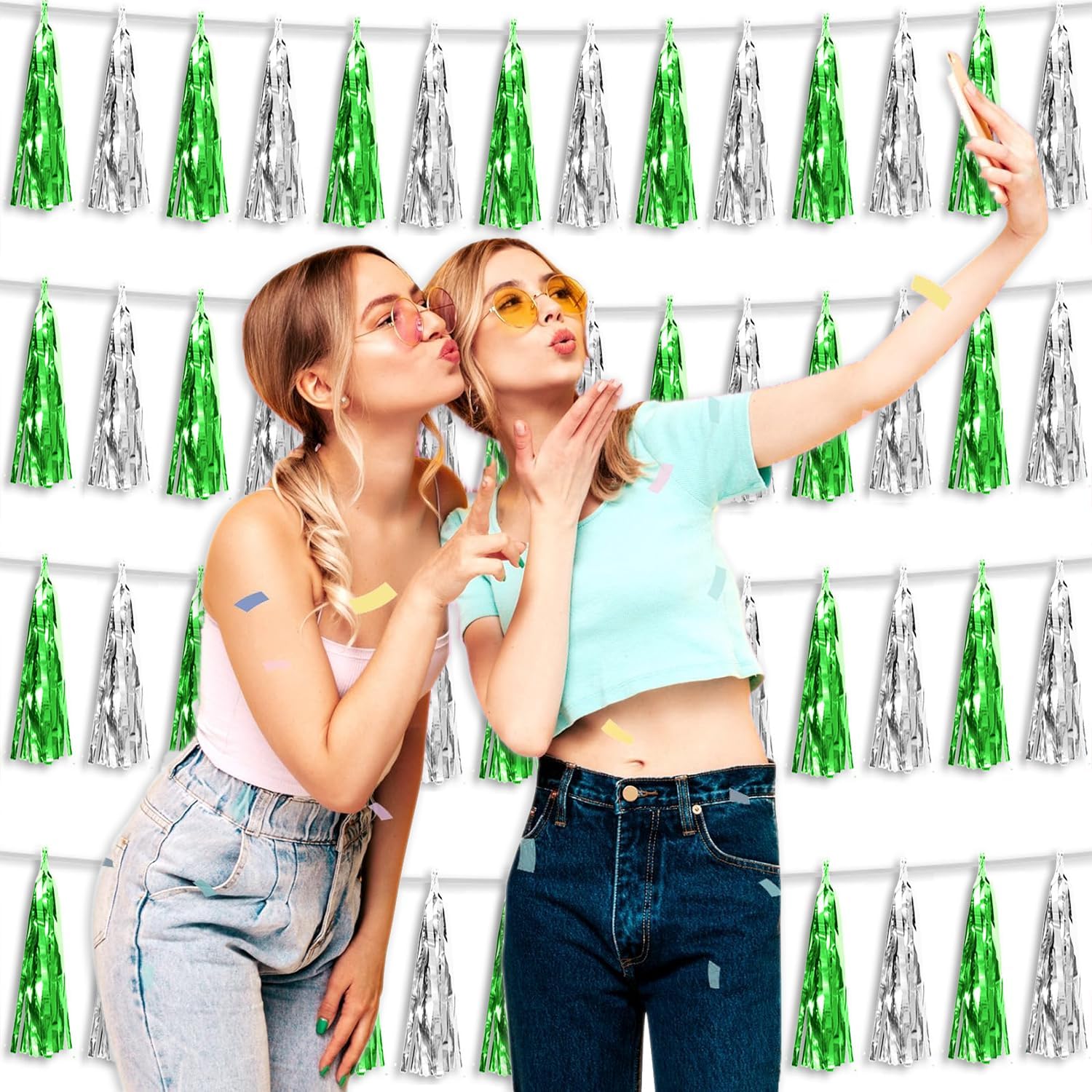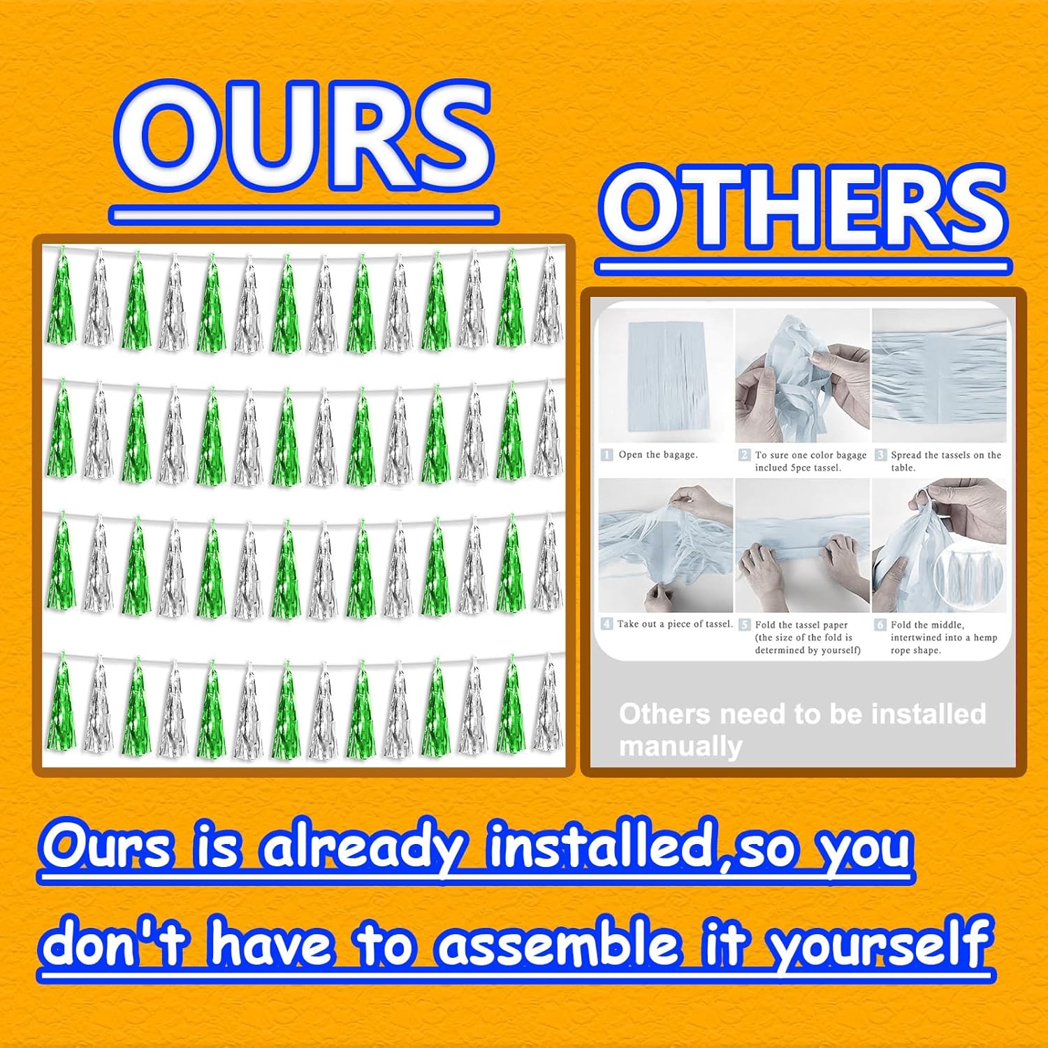 • 【Package Includes】The total length of the green silver birthday tassels banner is 40 feet, divided into 4 strips, each 10 feet long. Each banner contains 15 tassels, and each tassel measures 14 inches, for birthday decorations many occasions uitable for Patriotic display, Homecoming Float, Christmas Float, ecorative metal trailers, graduation floats etc