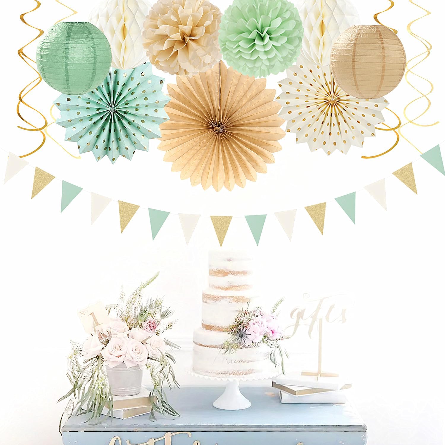 • 1[Package Includes] Sage-olive green champagne gold party decorations kit contains: 1 x triangle bunting, 4 x paper fans, 9 x tissue pom poms, 2 x honeycomb balls, 4 x paper lanterns, a total of 20 pieces of various sizes and colors of decorations. Better embellish your party.