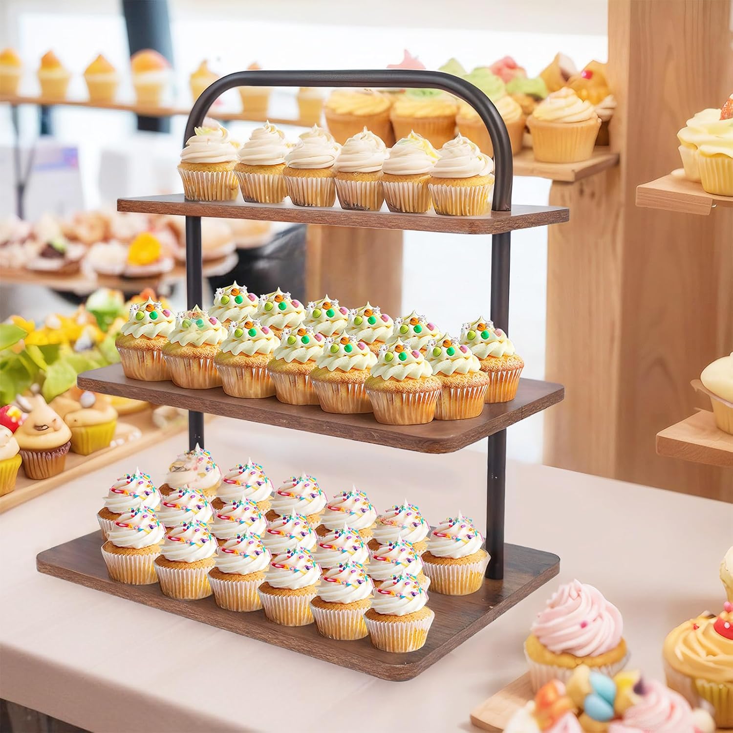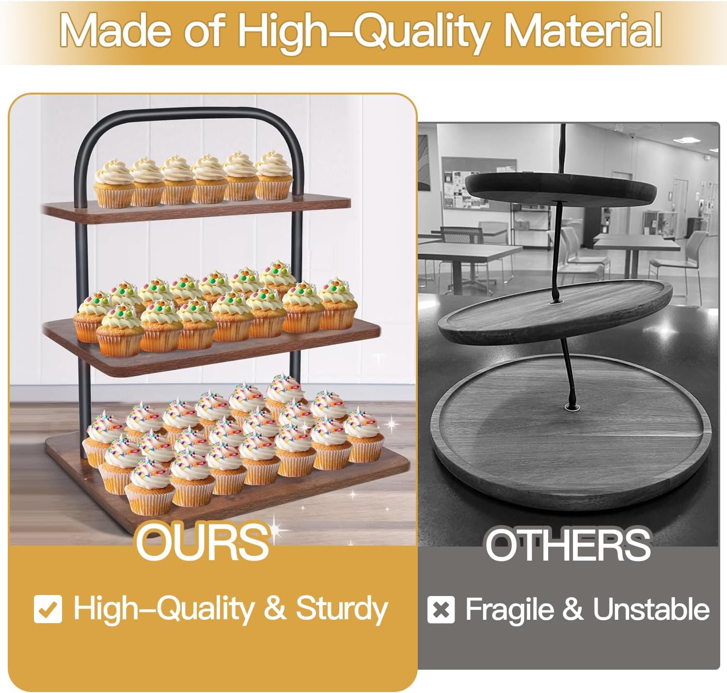 • [Cupcake Stand for 50 Cupcakes] The cupcake stand features a 3-tier square wooden board structure, capable of effortlessly accommodating up to 50 cupcakes measuring 2" each. The largest board measures up to 15.7” Lx11.8” W. The 3 tier large cupcake stand meets various party needs and is designed with a height difference of 6" for easy access.