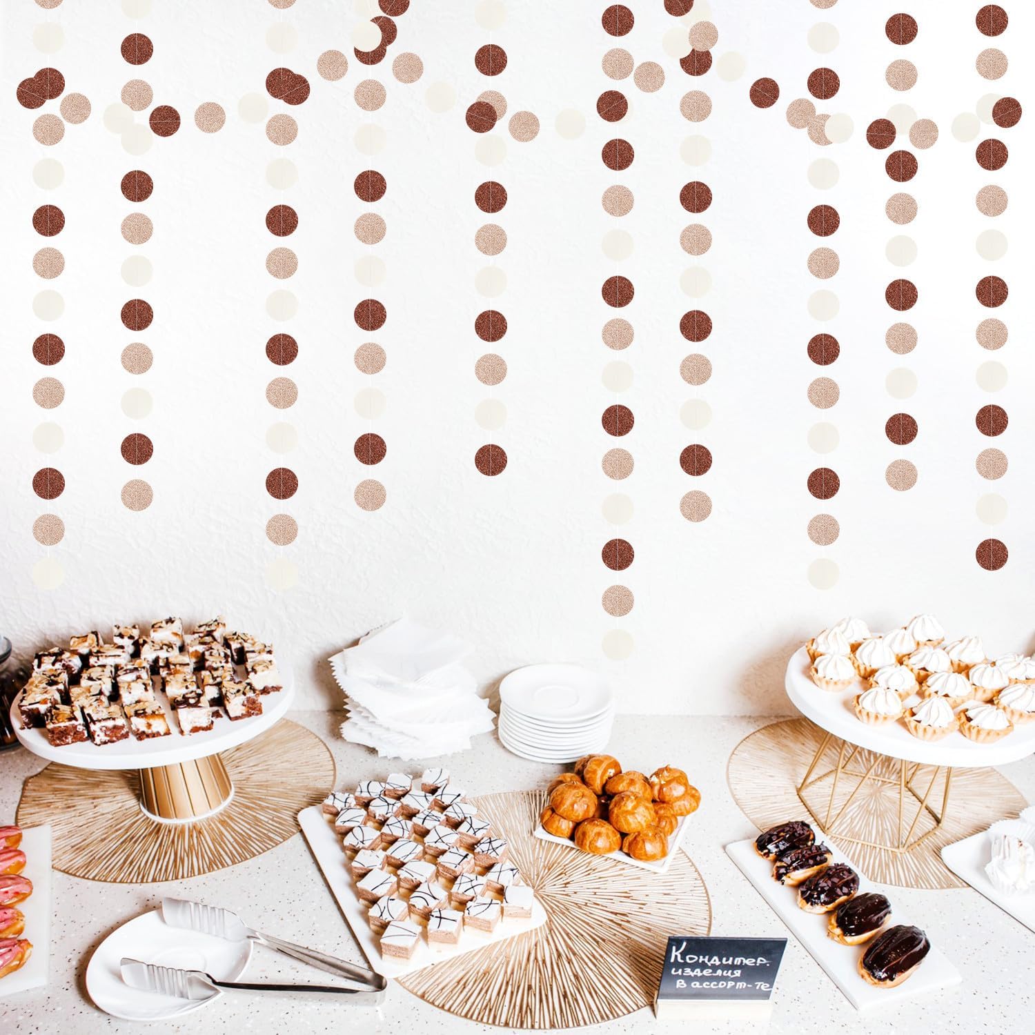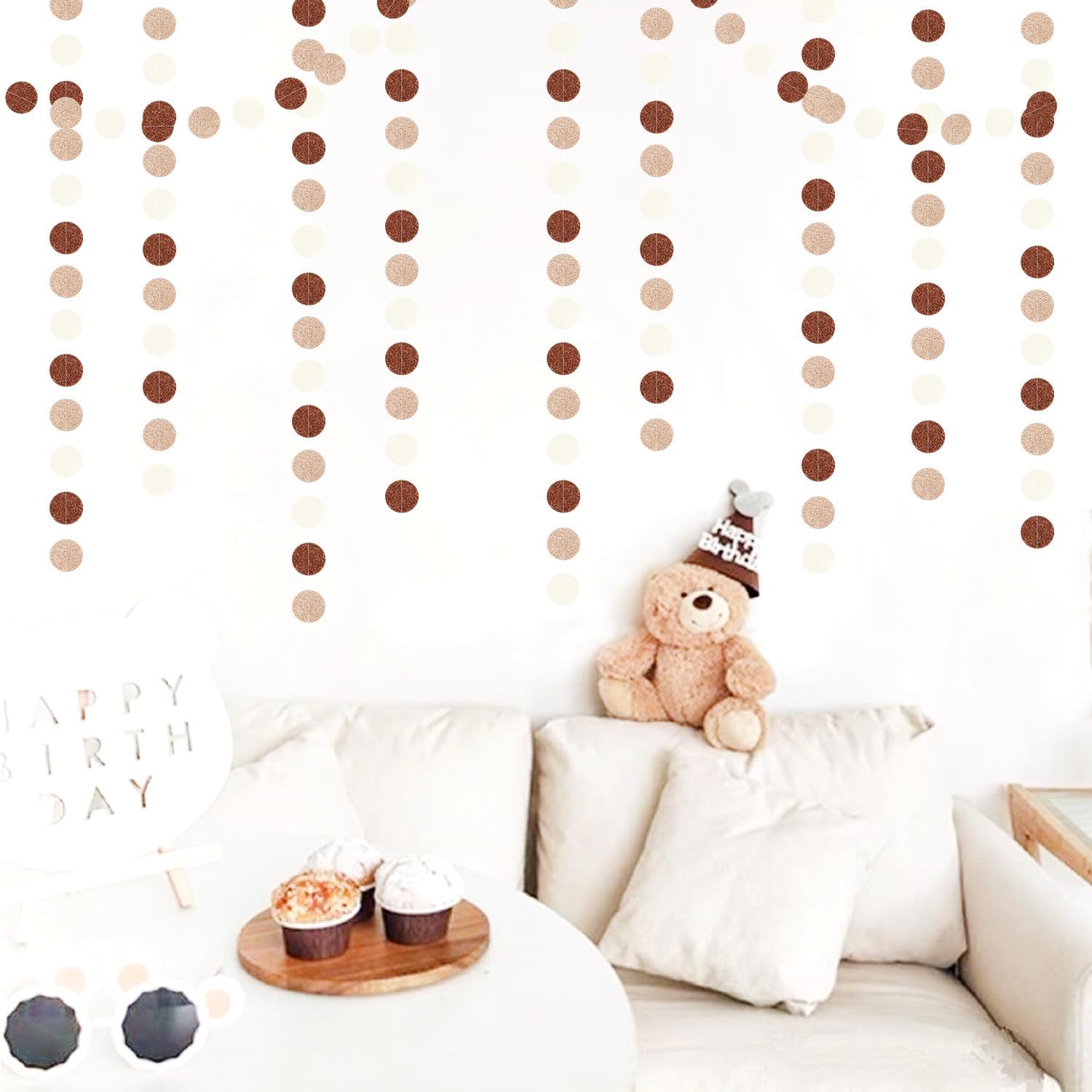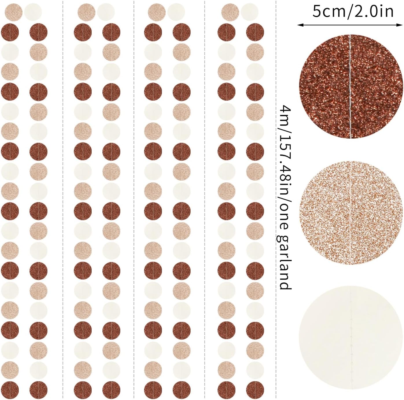• 【Brown Champagne Gold Party Decorations Kit Includes】The party garlands includes 4pcs paper garlands, each backdrop bunting is 13 feet/ 4 meters long, total length is 52 feet/16 meters. Every Banner has 40pcs dots which the size is 2".