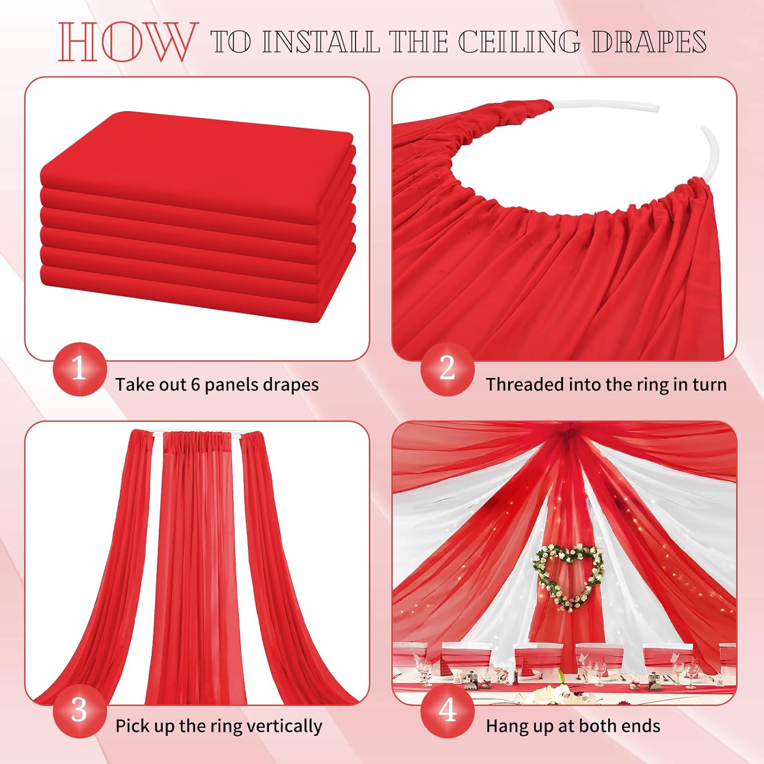 6 Panels Red Ceiling Drapes for Wedding 5ftx20ft Chiffon Fabric Arch Draping Curtains Sheer Drapery for Party Ceremony Birthday Baby Shower Reception Stage Swag Ceiling Decorations