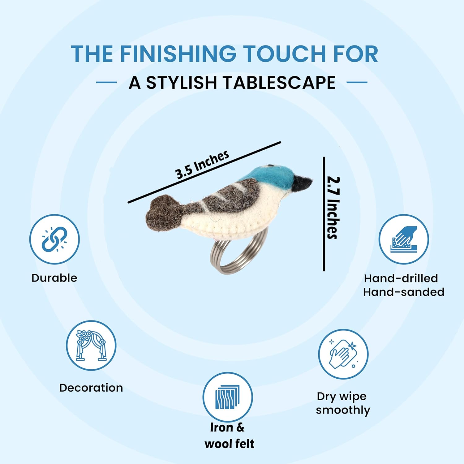 Wool Felt Napkin Ring Set of 8 - Bird Napkin Holder for Dining Table with Silver Electroplated Metal Base - Perfect for Spring, Holiday Parties, Rustic Event (White Blue Grey Black) - CLEENTABLE
