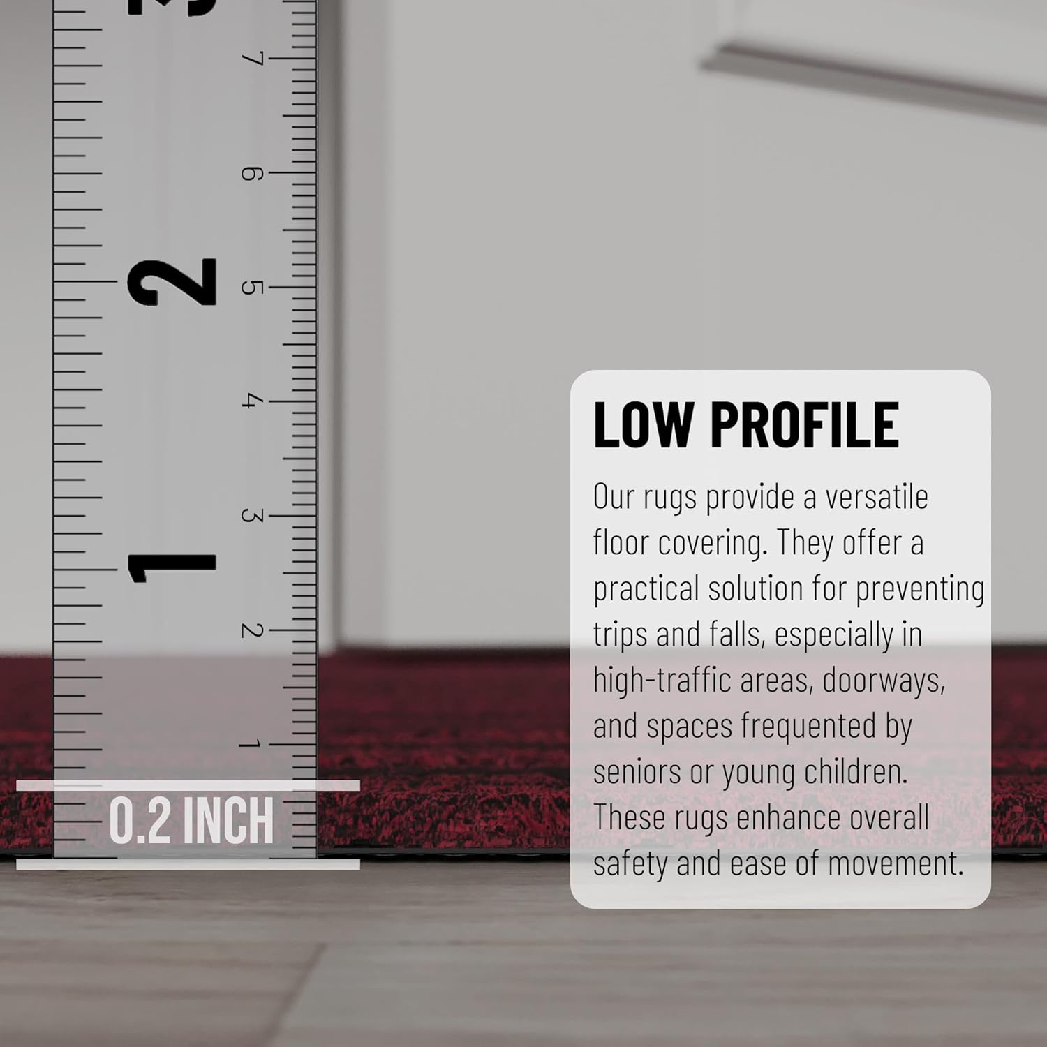 • [ULTRA THIN PILE]: An ultra thin pile thickness of 0.2 inches offers ideal functionality that is perfect for busy areas, underneath furniture, and in entryways as it will not obstruct doorways.