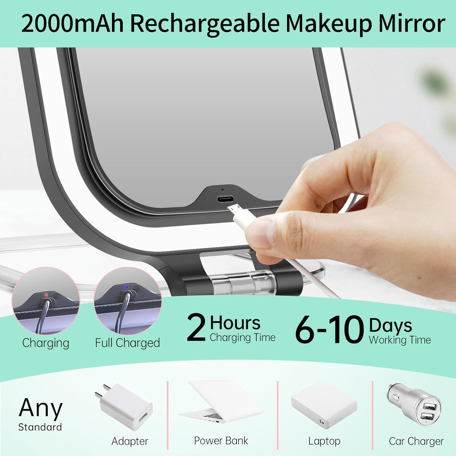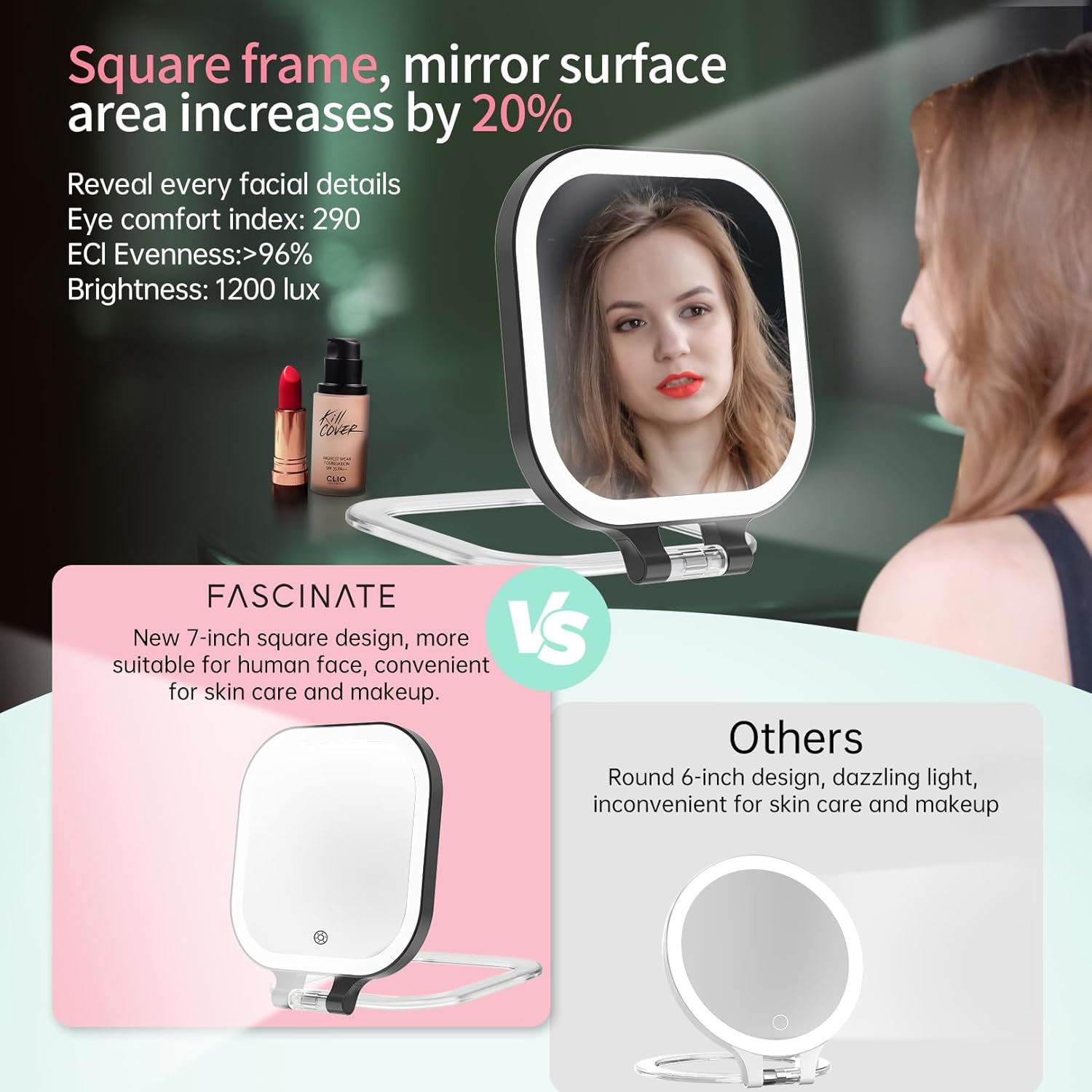 • 💝【FASCINATE 2025 Upgraded Travel Makeup Mirror】 In response to customer requests for a more travel-friendly magnifying makeup mirror, we have upgraded the 2000mAh rechargeable lithium battery. The travel mirror with light can be used for 6-10 days when fully charged. The travel mirror size is: 8.1 * 7.1 * 0.98 inch, weights only 0.9 lb, which is enough to meet your makeup and touch-up needs for daily commuting and 2-3 days of business or travel.