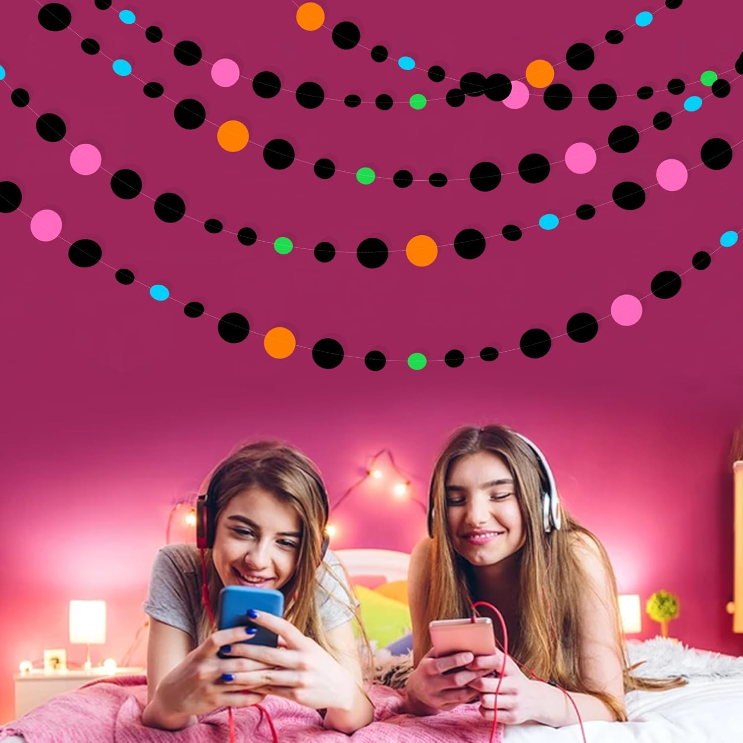 • Package Contains: 4 set of colorful black circle dot party garlands banner,each string is 11.5 feet/3.5 meters, Total is 14 meters/46 feet.