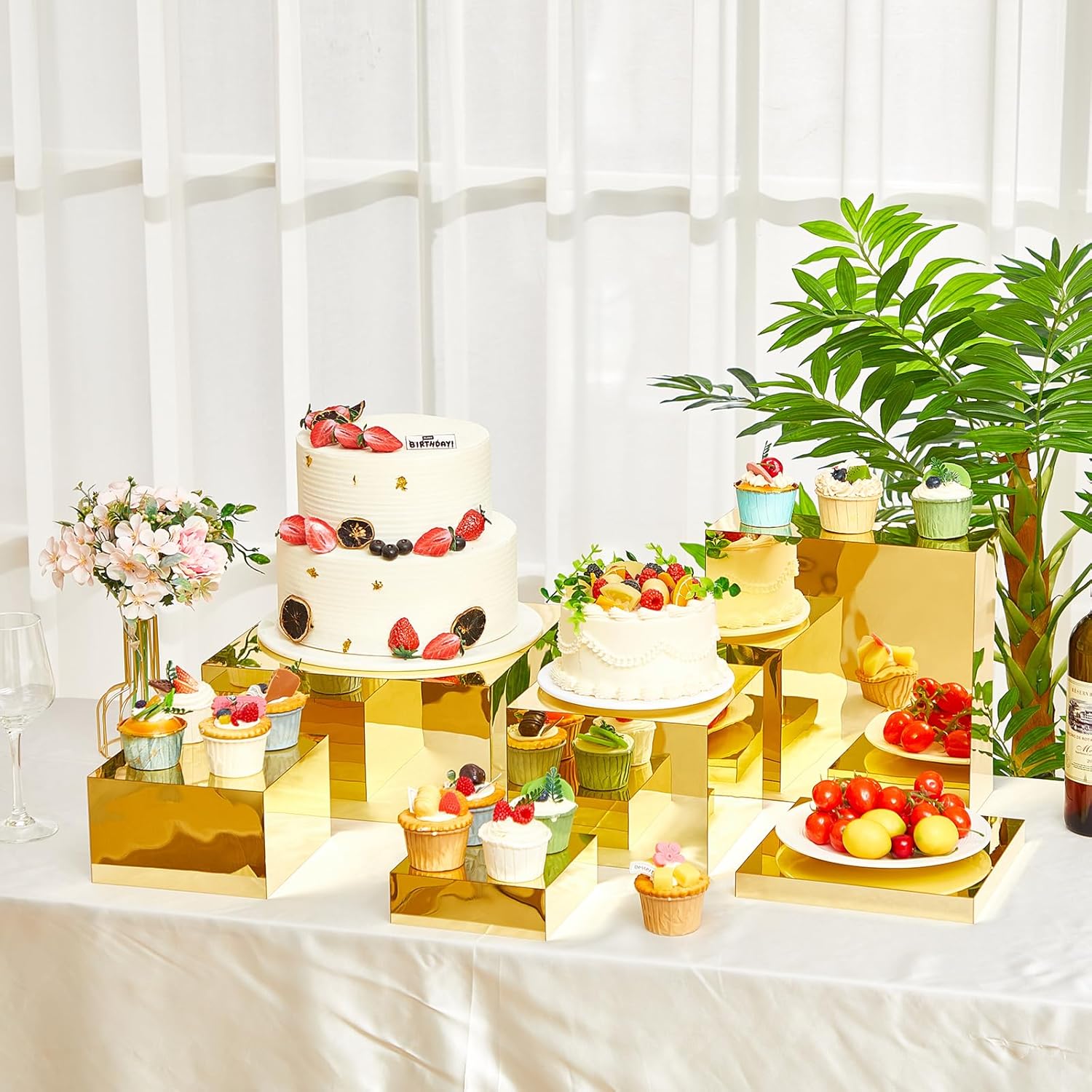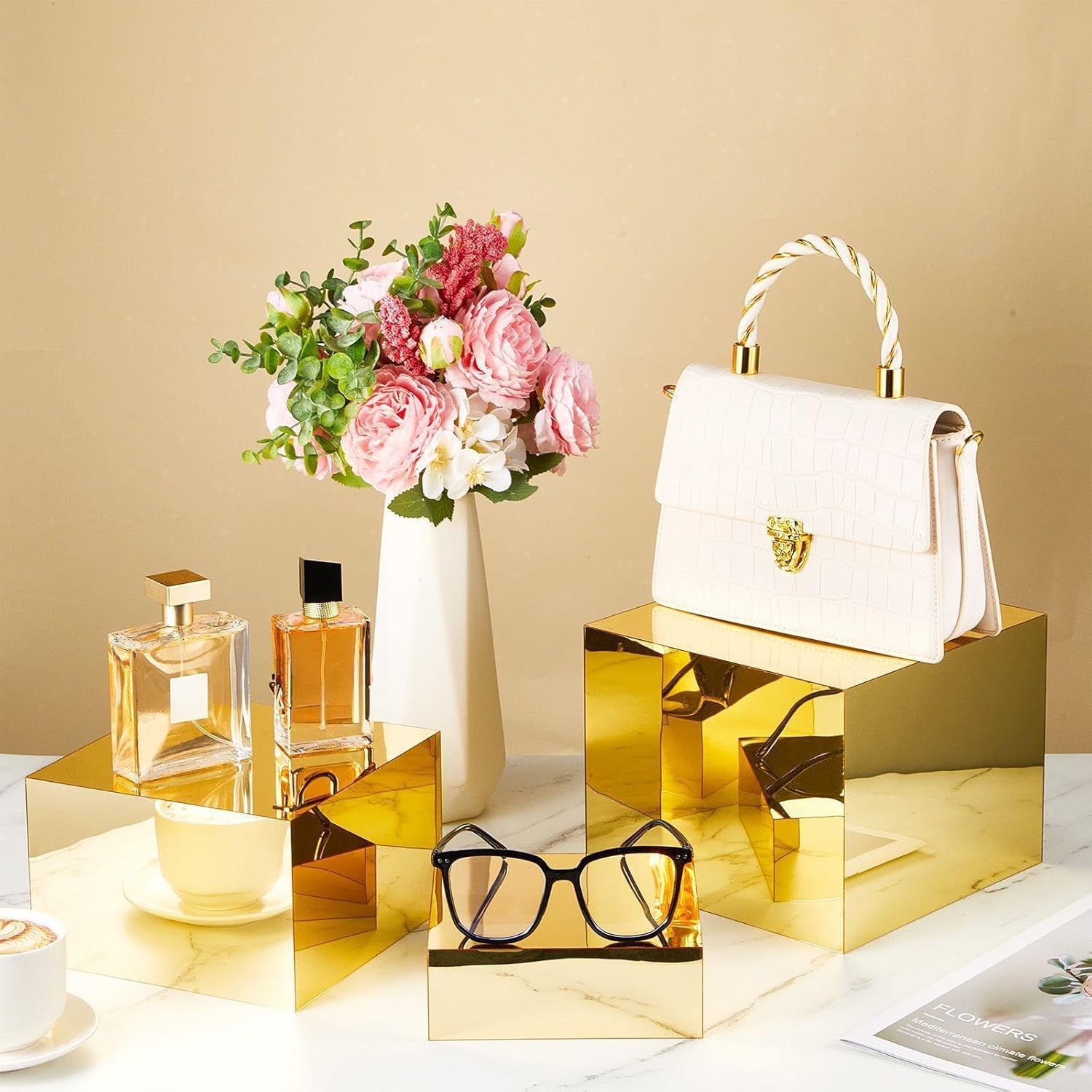• Gold Aesthetics: our acrylic display stands showcase a simple yet elegant design; The gold color offers an unobstructed view of your displayed items, enhancing their beauty and visibility; Whether it's jewelry, cakes or other products, these cubes ensure they are the center of attention
