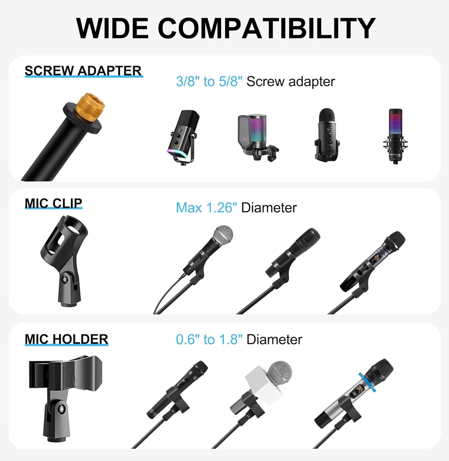 • 【Steady Tripod Stand】The heavy duty microphone stand base legs are 16"/40cm long, with a range of 11.8"- 27.6"/30-70cm expanded and contracted between the legs, which is longer than others to hold the microphone firmly in place, and the non-slip foot covers prevent mic tripod stand from moving around