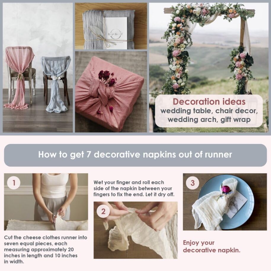 • Occasions to apply. Our cheese cloth table runner is a versatile piece that can be used for various occasions such as weddings, baby showers, bridal showers, and birthdays.