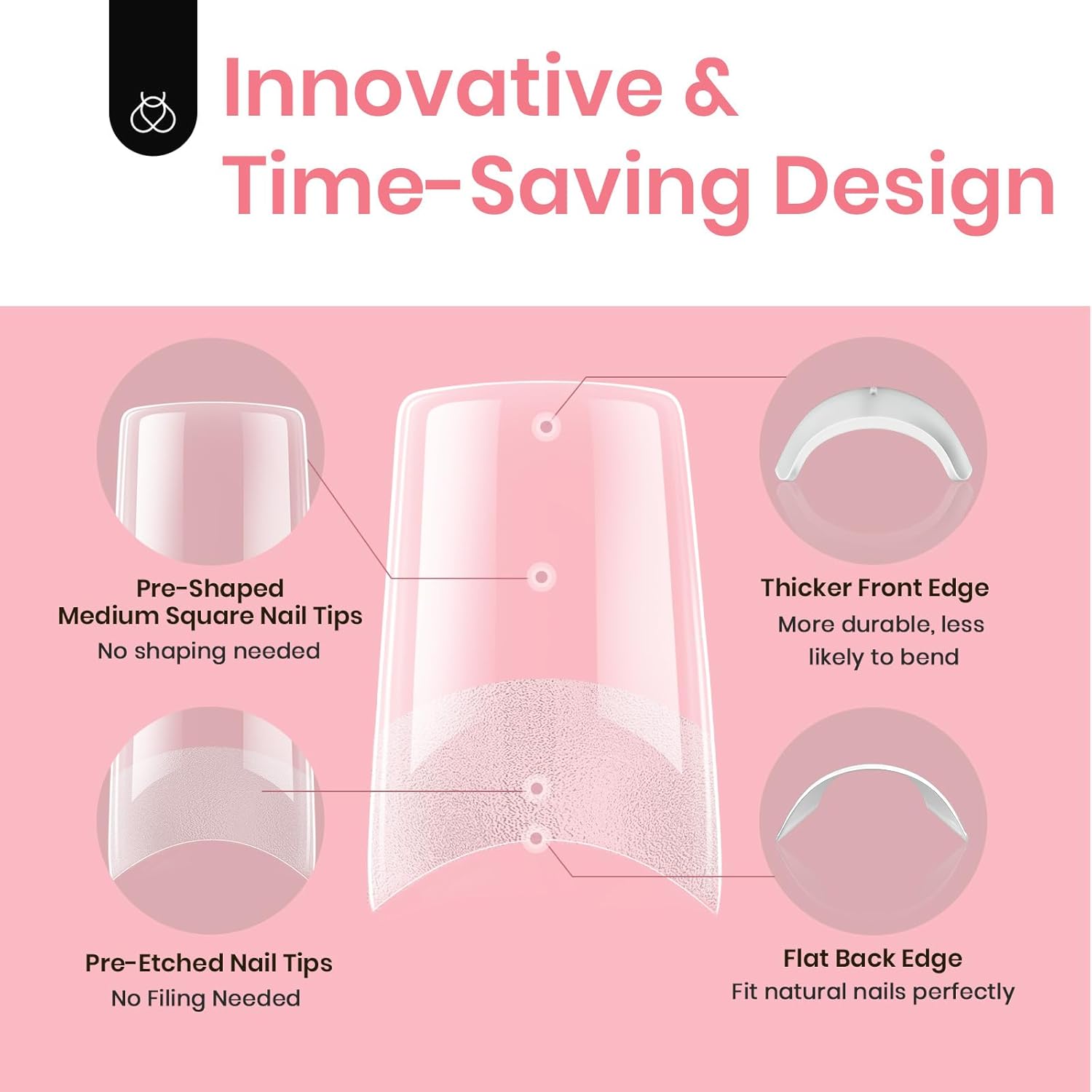 • Easy Application with 10ml Nail Glue: Medium square nail tips come with a 10ml bottle of fast-drying nail glue, ensuring hassle-free and secure application for beginners and professionals alike. These half-cover, nail tips are great for creating trendy, custom nail designs like French tips, ombré effects, or intricate nail art.