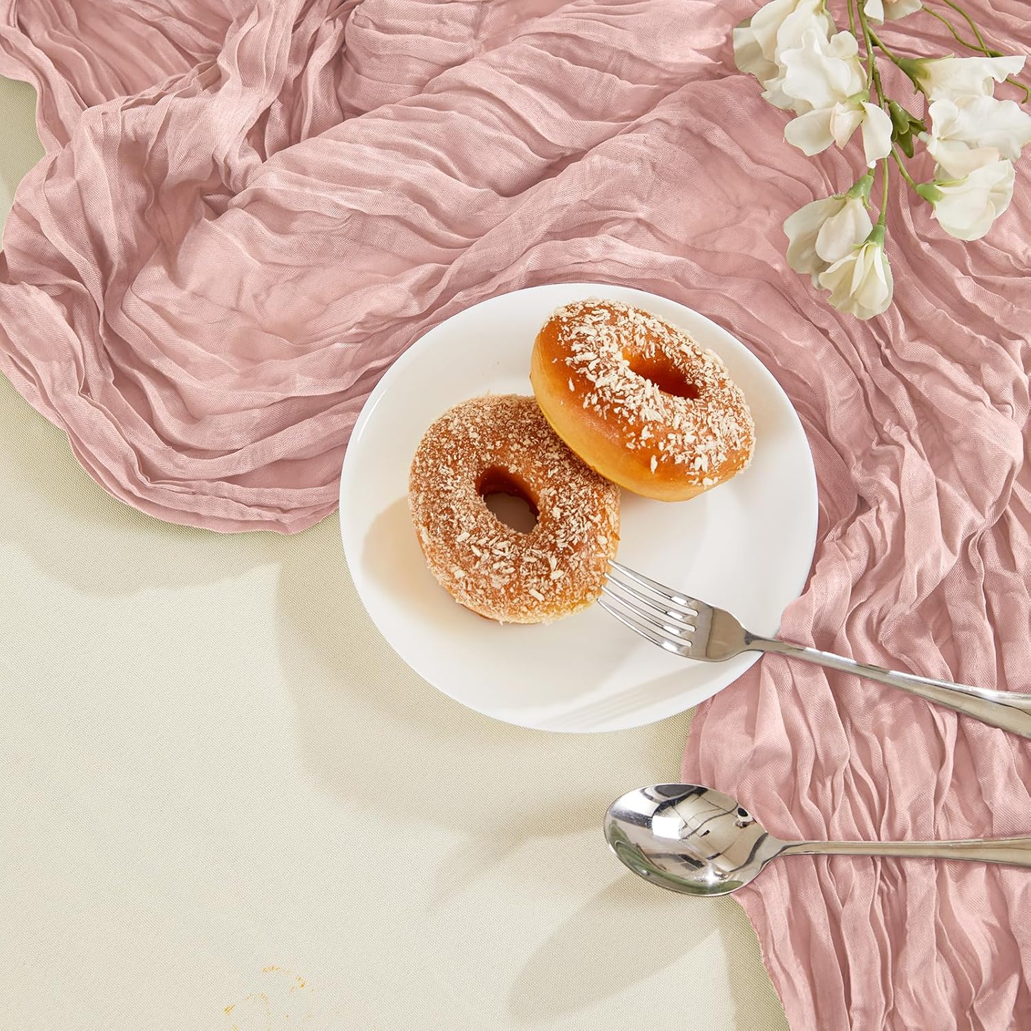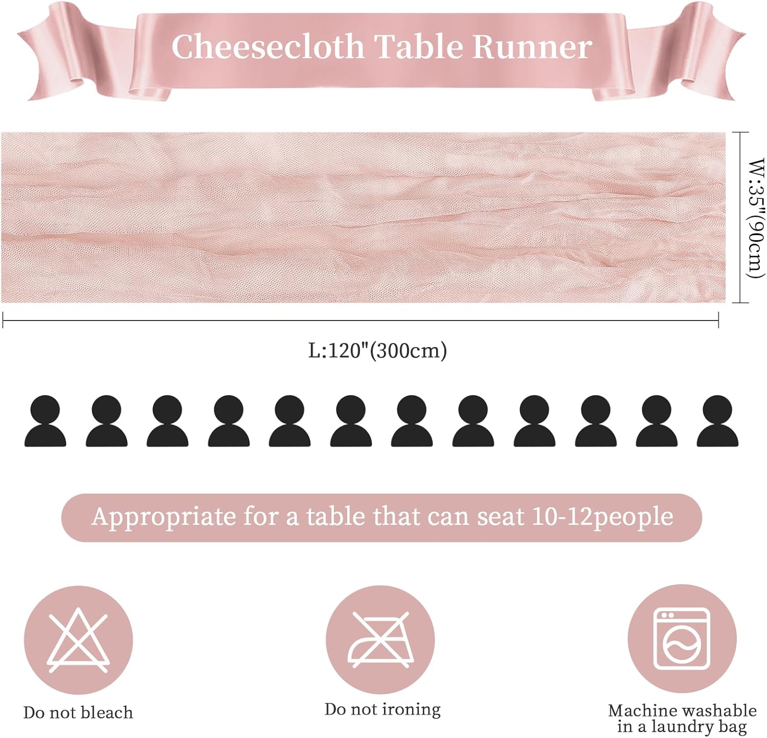 • PACKAGE INCLUDED: You will receive 6PCS dusty pink cheesecloth table runner. Elegant and beautiful design, exquisite workmanship. Product size: Each boho table runner is 35 x 120 inches. Enough to cover rectangles and round tables, as well as long tables that are stitched together. It can even be used to belt chairs or decorate table scarf, background curtains or even gift wrap. Round or square tables for 8-10 people, perfect for romantic and elegant party events