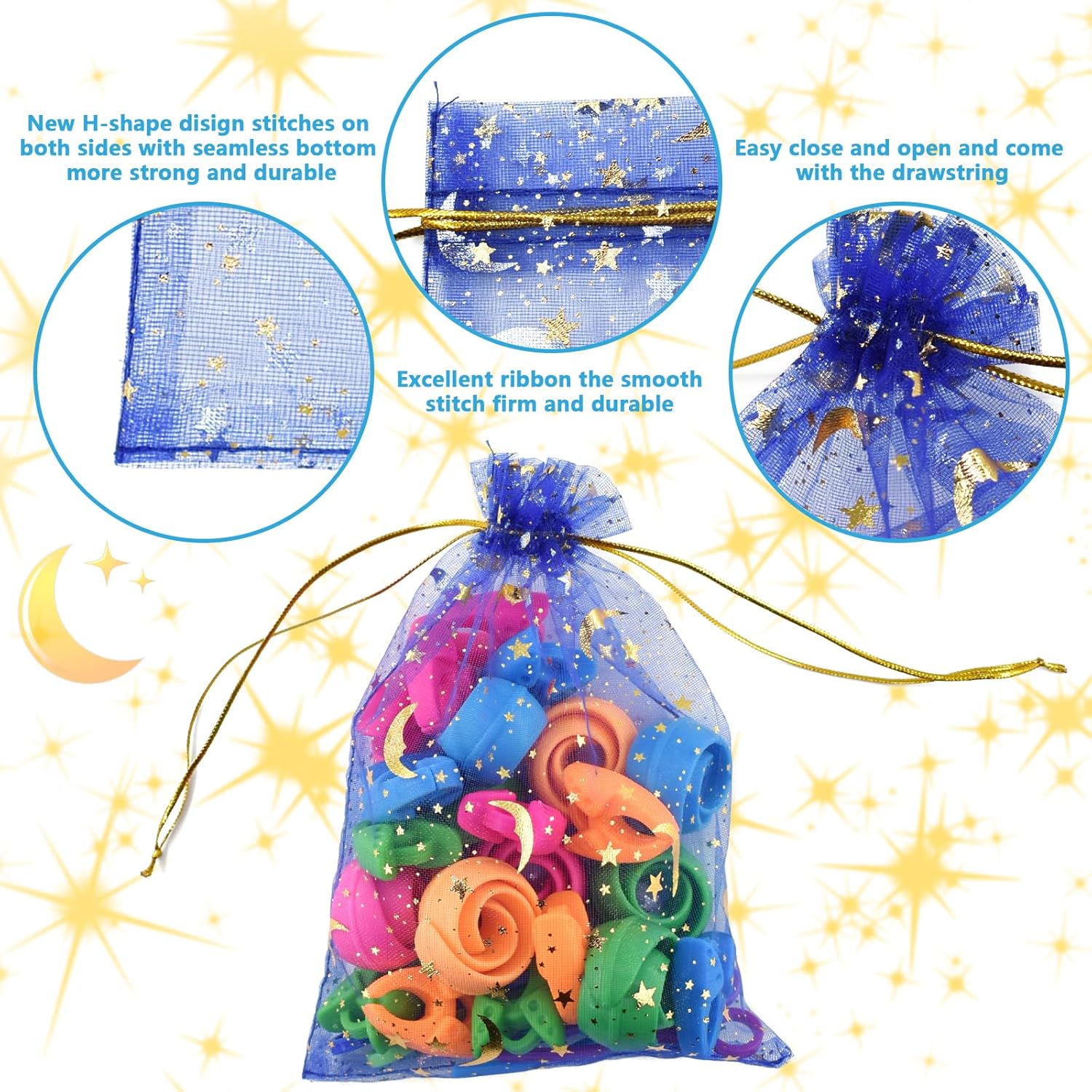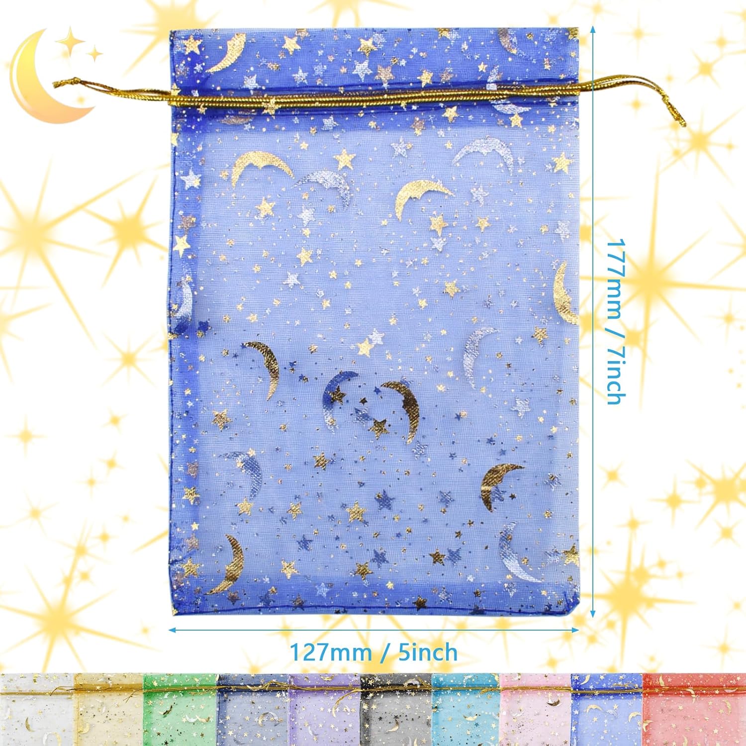 SHRJ 100pcs 10 Colors Organza Sheer Bags with Drawstring for Wedding, Valentine, Halloween, Christmas, Thanksgiving, Birthday Party Candy Gift Supplies, Moon Star, 5” x 7”
