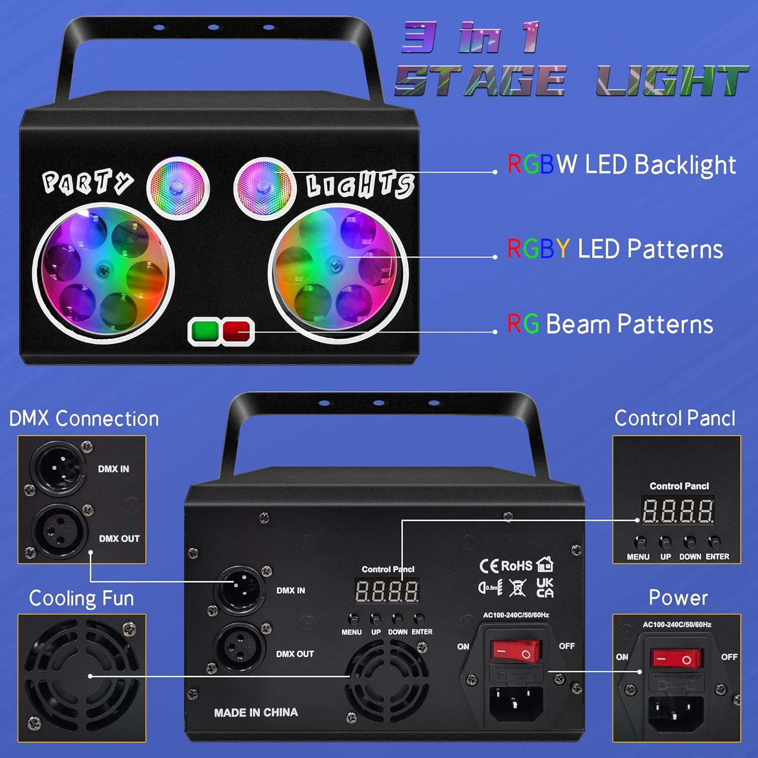 • 【Vibrant LED Patterns and Backlight Features】 Experience the brilliance of our Stage Light, offering a spectrum of LED patterns, beam modes, and captivating backlight effects. Watch as the light rotates and illuminates in vivid shades of red, green, blue, and yellow, creating mesmerizing visual displays. For an added dimension, integrate a fog machine to amplify the ambiance and captivate your audience.