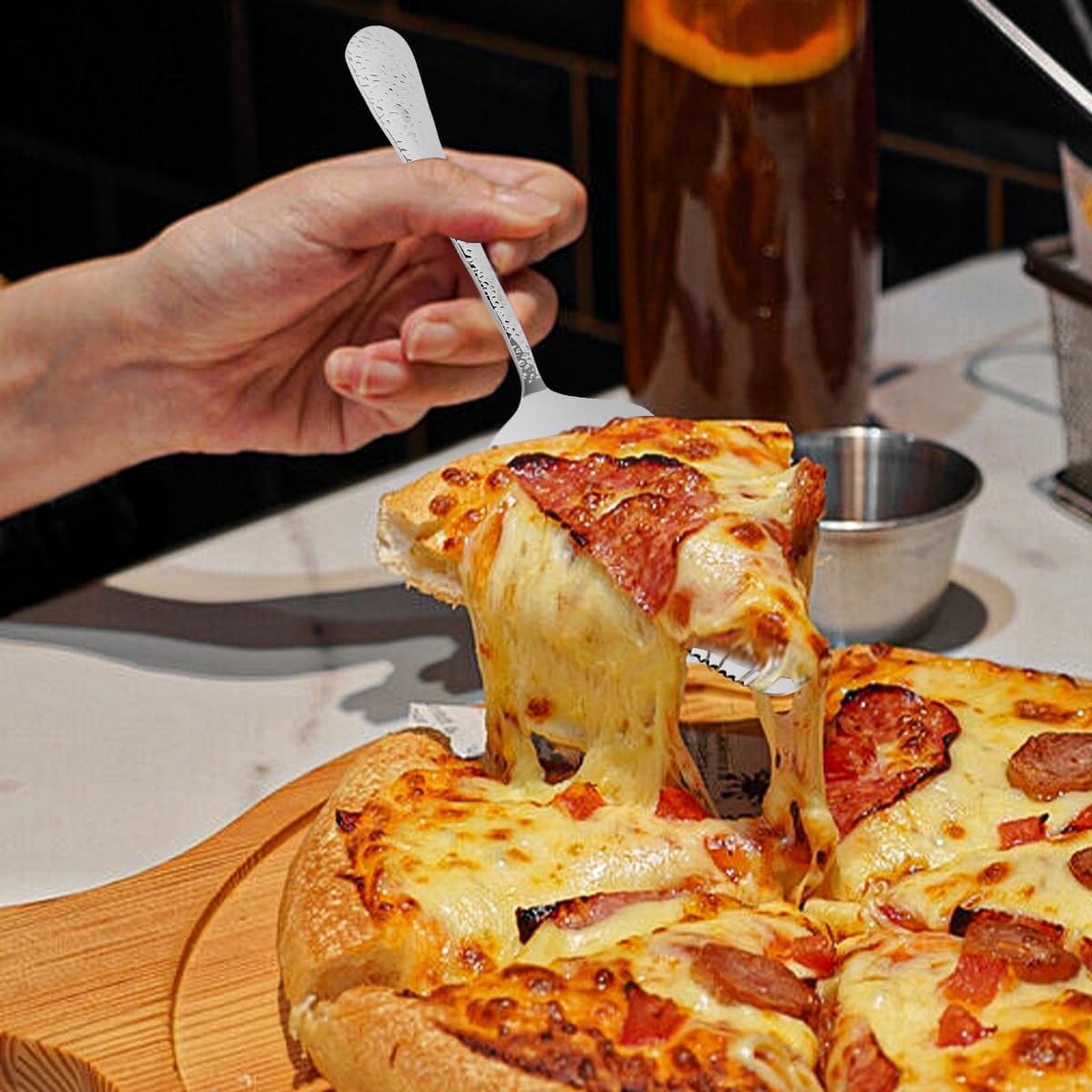 • 🍩FASHIONABLE APPEARANCE -- The cake server handle has a stylish hammering design, comfortable to the touch. Creating an elegant and eye-catching appearance, Suitable for any occasion and perfectly match your tablecloth