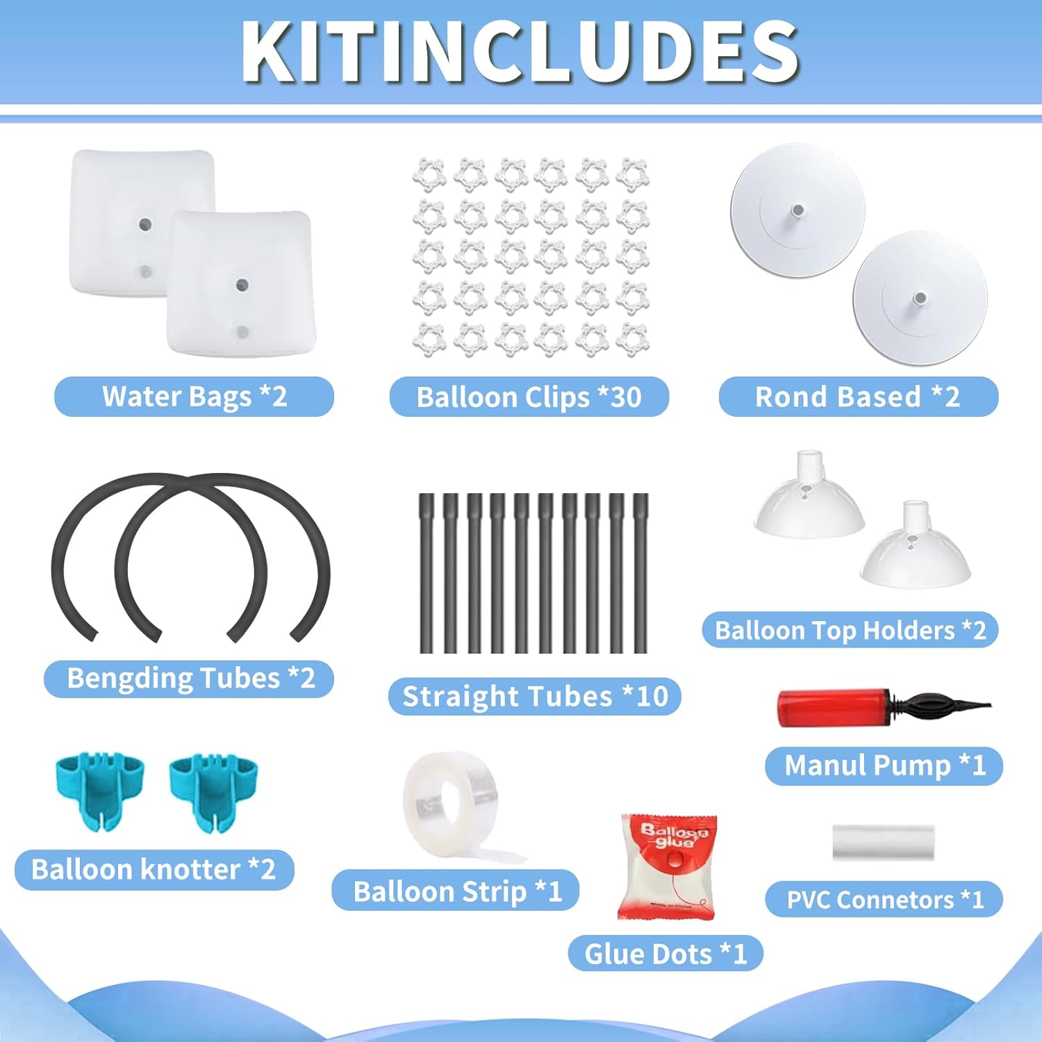 • 【All-in-One Kit】Our balloon arch kit includes everything you need: 10 straight poles, 2 bendable top poles, 2 round bases, 2 water/sand bags, 30 balloon clips, 2 balloon top supports, 2 balloon knotters, 1 roll of glue dots, 1 balloon arch strip, 1 PVC connector, 1 manual pump, and detailed instructions.