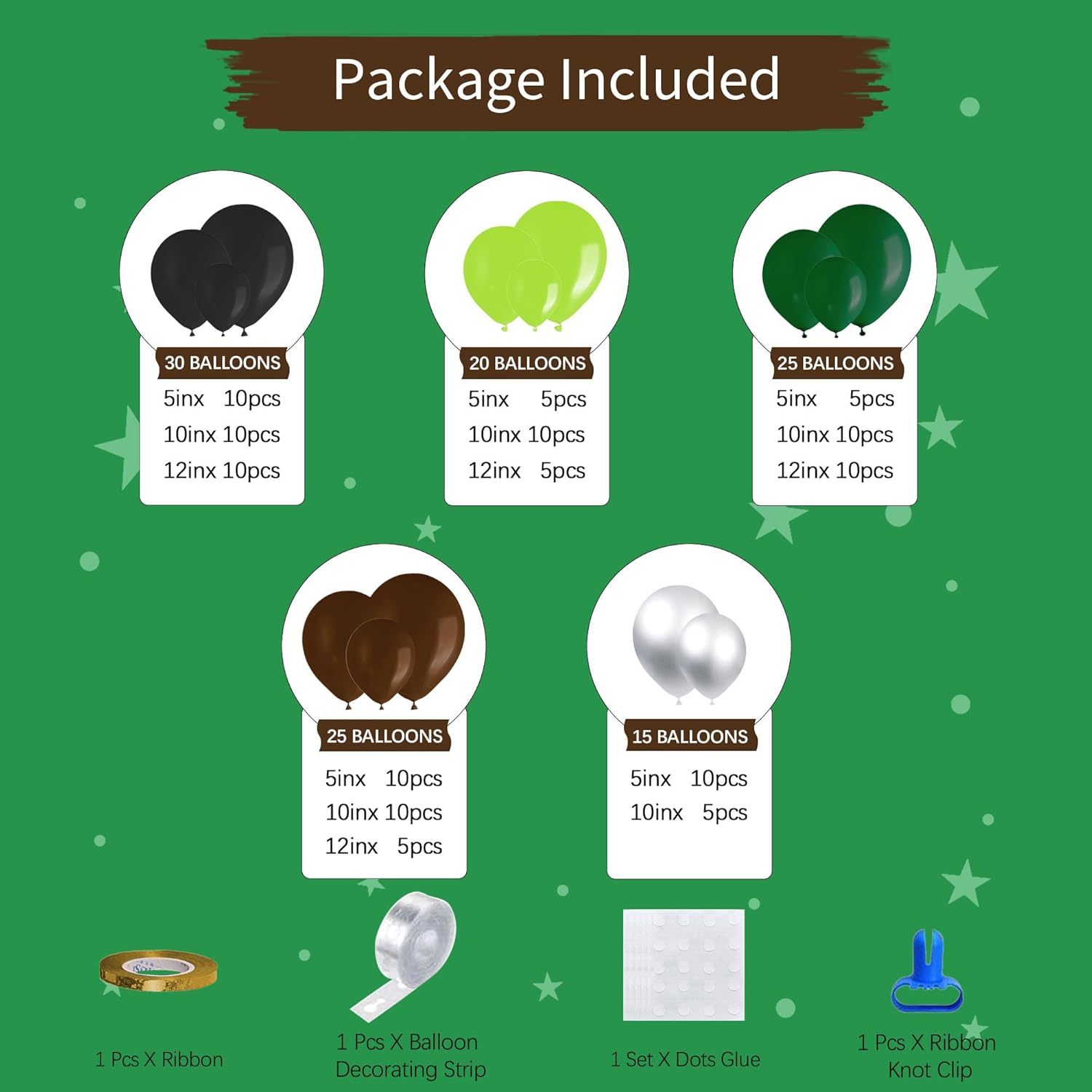 • 【Package Included】115Pcs green-brown black balloon garland kit includes 12-inch, 10-inch, and 5-inch latex balloons (detail see image), and 4pcs balloon arch DIY accessories. Our latex balloons are made from quality materials, ensuring they maintain their shape and color for longer periods. This means that your balloon arch will stay looking fresh and vibrant throughout your event, leaving a lasting impression on your guest