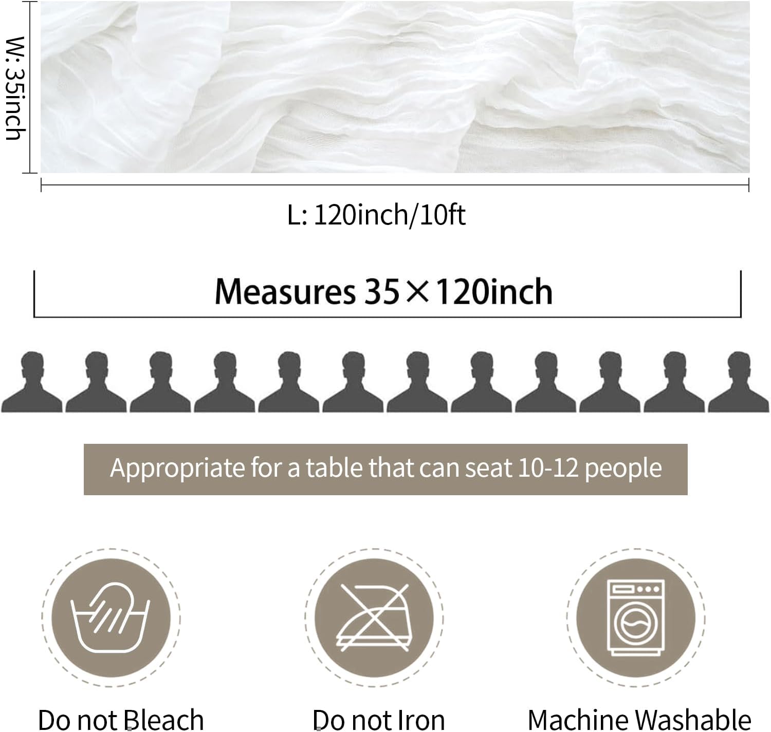 • 🥂【IVORY TABLE RUNNER BULK】You will receive 1 piece of white cheesecloth table runners. Elegant and beautiful design, exquisite workmanship. Product size: Each boho table runner is 35 x 120 inches. Enough to cover rectangles and round tables, as well as long tables that are stitched together. It can even be used to belt chairs decorate napkins, background curtains, or even gift wrap. Round or square tables for 8-10 people, perfect for romantic and elegant party events.