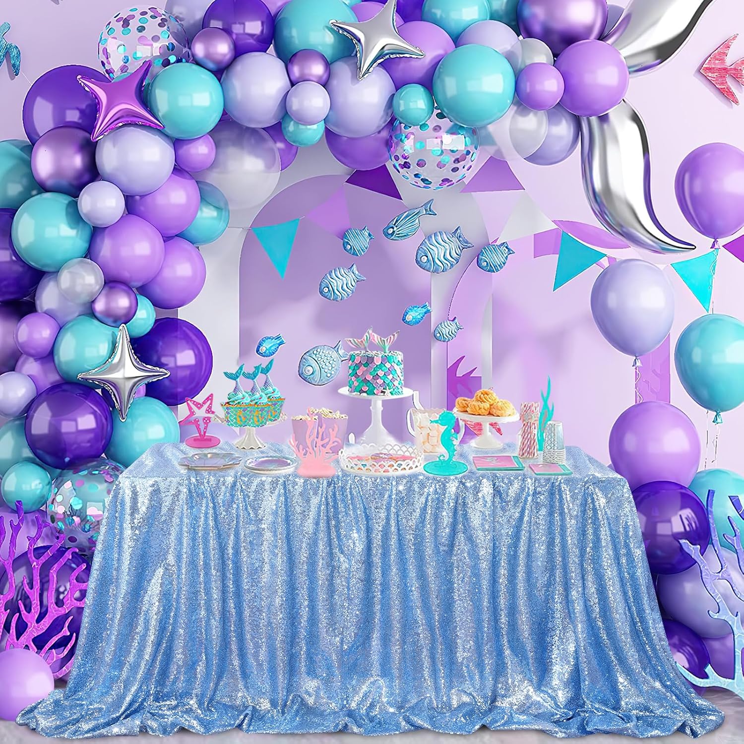 QueenDream Baby Blue Party Tablecloth Decoration: Rectangle Shimmer Mermaid Tablecloth 90x90 Inch Sequin Cloth Frozen Birthday Decorations