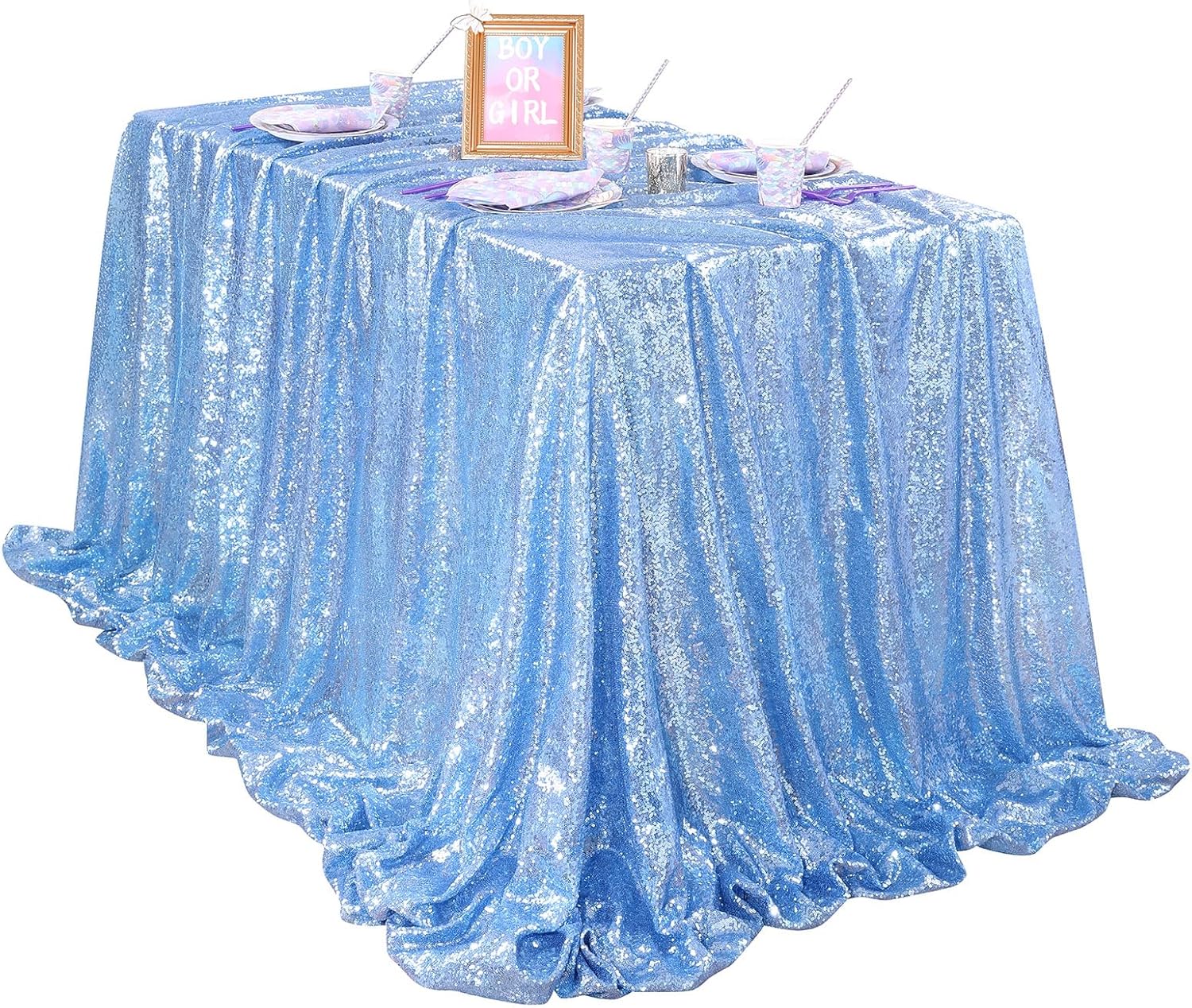 • Seamless Baby Blue Sequin Tablecloth Size: 90" wide x 90" long. Image dimensions are for reference only, please choose the size according to your needs.