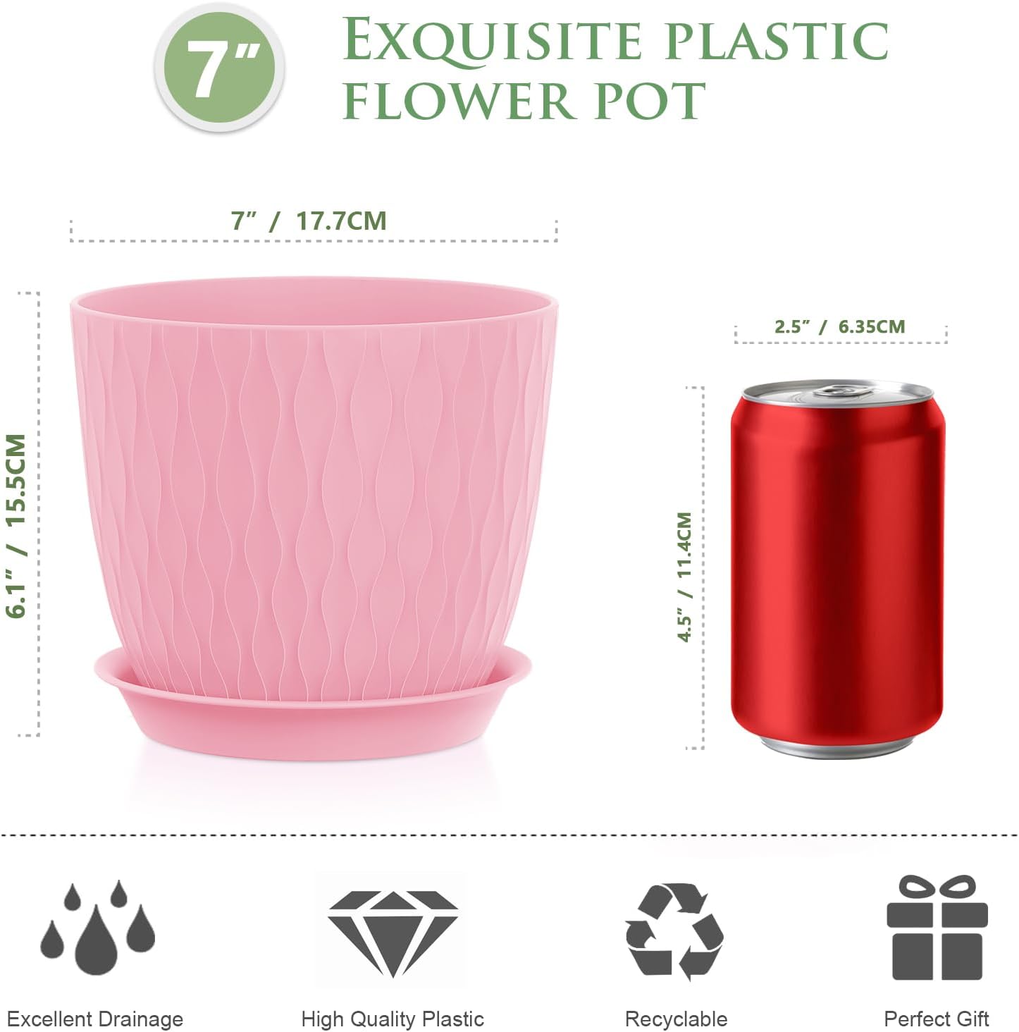 7 inch Plant Pots, 5 Pack Flower Pots with Drainage Holes and Saucers for Indoor Plants, Plastic Planters with Water Ripple for Small Garden House Plants, Nursery Pots for Succulent, Colorful