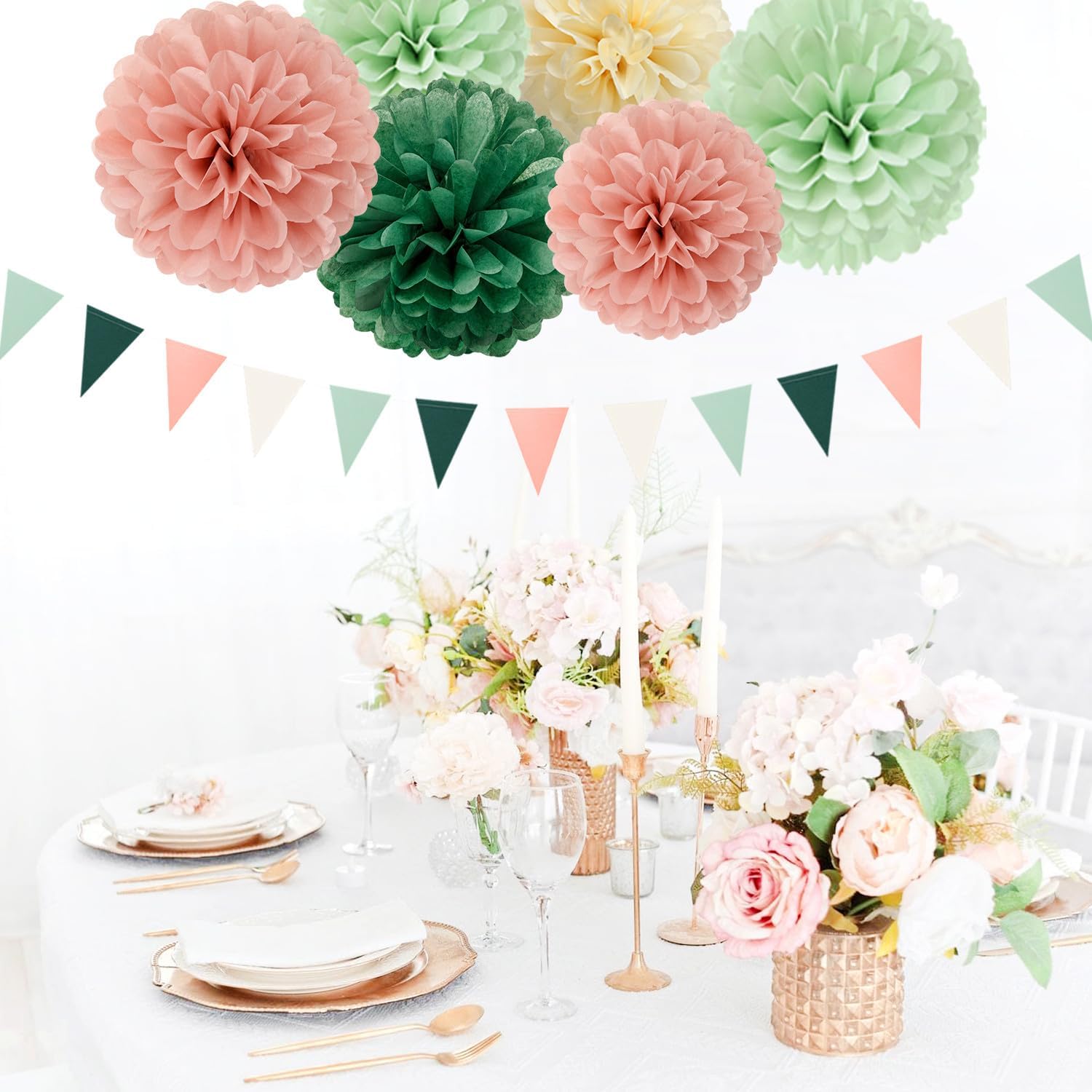 Sage-Olive Green Pink-Beige Boho Party Decorations -23pcs Rustic Neutral Wedding Paper Tissue Pom Poms Streamers,Tassel Garland Banner,Birthday Baby Bridal Shower Engagement Decor Lasting Surprise