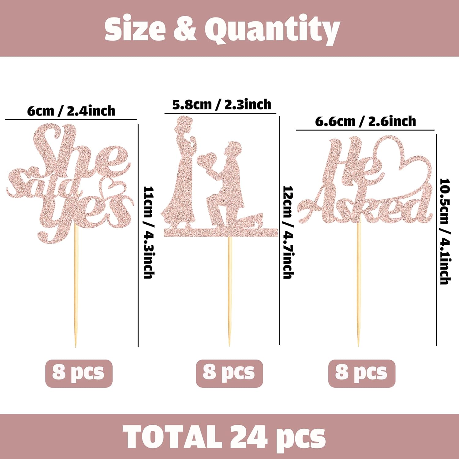 • Unique Design: This rose gold 24PCS He Asked She Said Yes Cupcake Toppers to make your Wedding Engagement party stand out! The delicate design like your a match made in heaven makes your dessert look more romantic. Shimmering glitterscreate a lovely and sweet feel for your wedding party