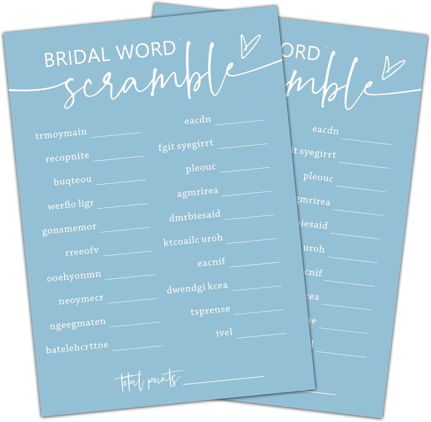 Minimalist Bridal Shower Games, 30 Light Blue Bridal Word Scramble Cards + 1 Answer Card, Wedding Bachelorette Engagement Party Supplies - A16