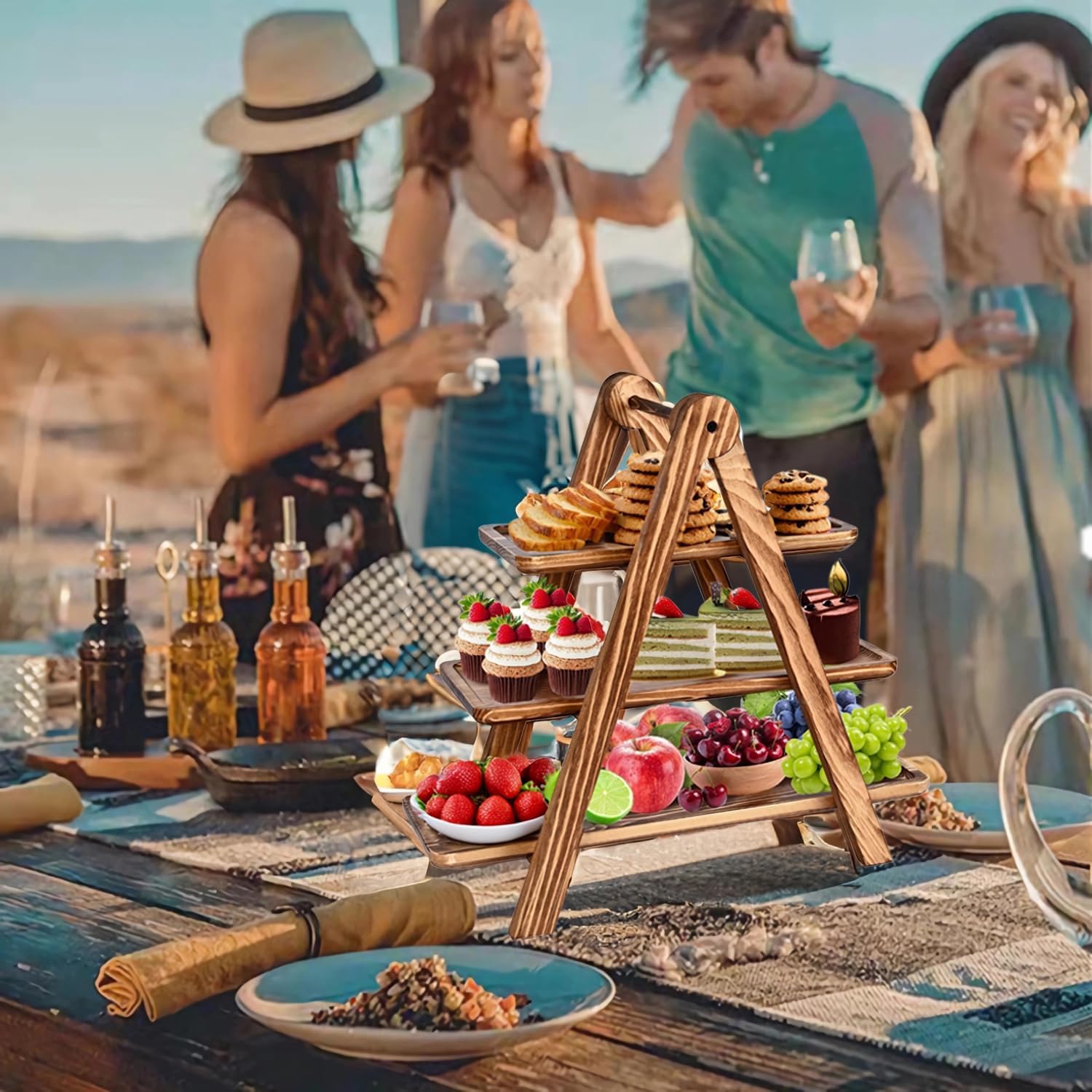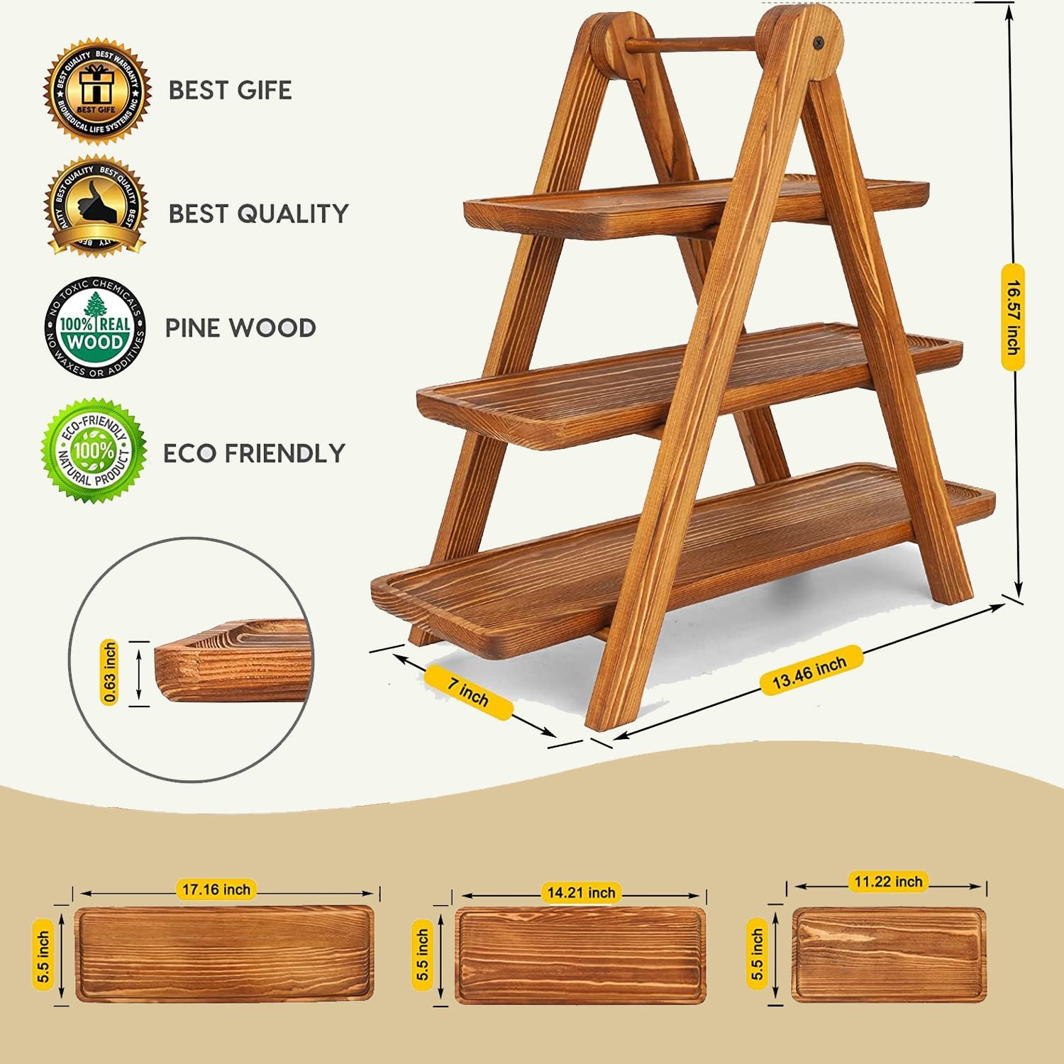 • Serving Tray Structure and Dimensions: This Serving Tray has a Detachable 3-tier structure,Stand with 3 rectangular trays of various sizes and 1 ladder rack,You can use it with the rack or use the wooden tray alone!The large tray 17" x 5.5" the medium tray 14"x 5.5" and the small tray 11"x 5.5",the ladder rack 13.46"x7"x17.04". accommodating a range of dessert sizes. The 4-inch spacing between tiers provides ample room for showcasing cakes, fruits, snacks, and other foods.