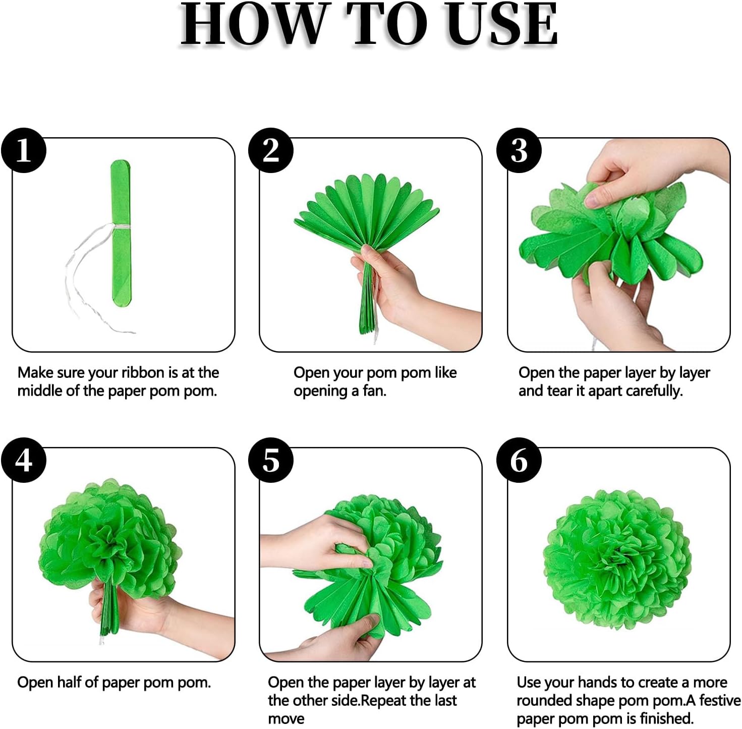• 【DIY Hanging Pom Poms】These paper pom poms are shipped folded. Assembling requires time and patience to separate each paper layer and fluff. Each pom pom is individually packaged and is very easy to assemble to follow the instructions, begin by pulling from the outer edge and gently peeling away each tissue paper layer. With delicate strokes, fluff the pom pom into a rounded shape.