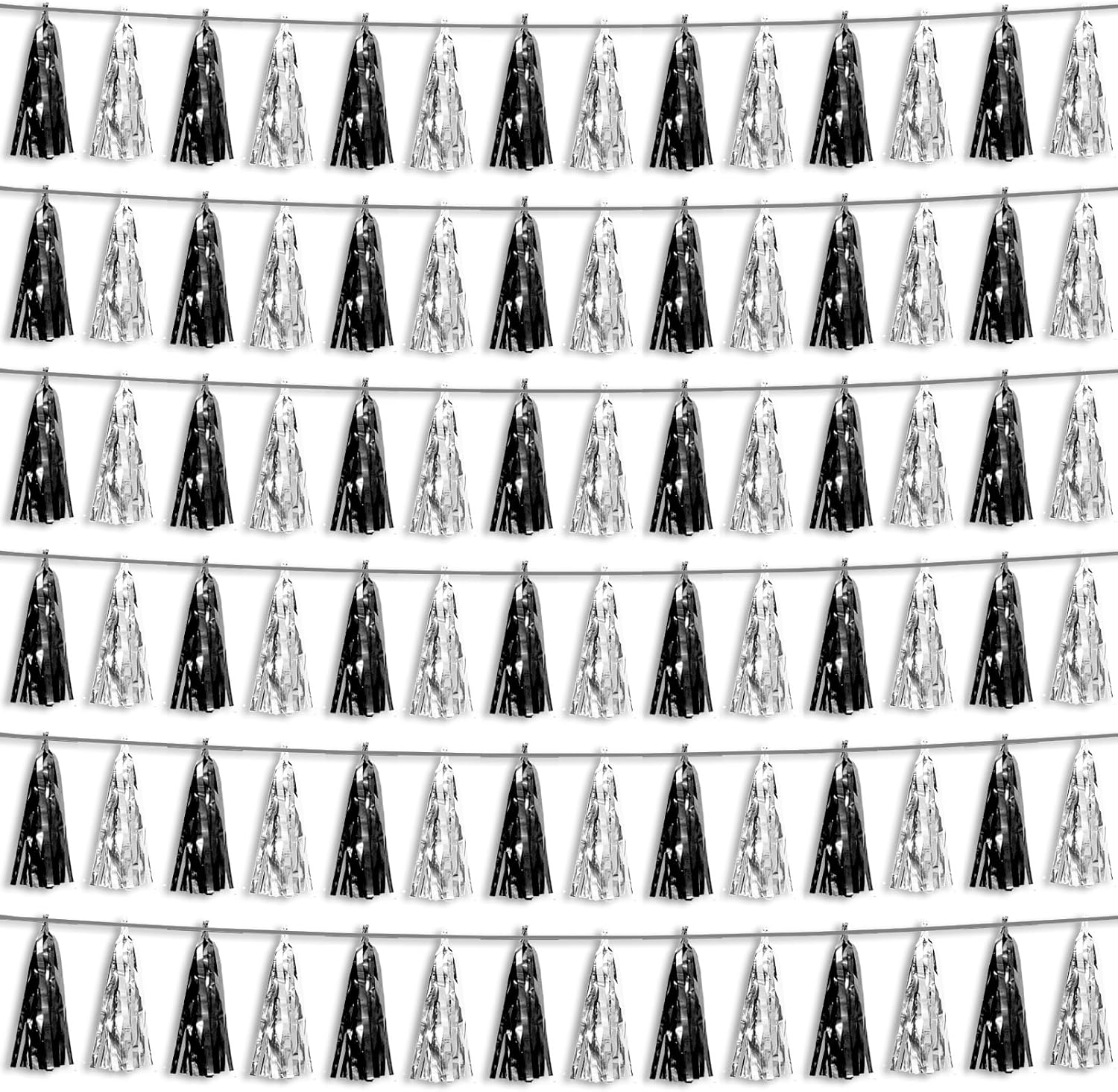 6P Black Silver Foil Fringe Metallic Tassel Streamers Banner Tassel Garland for Parade Floats, Graduation, Wedding, Birthday, Graduation, Christmas, Bridal/Baby Shower Party Decorations
