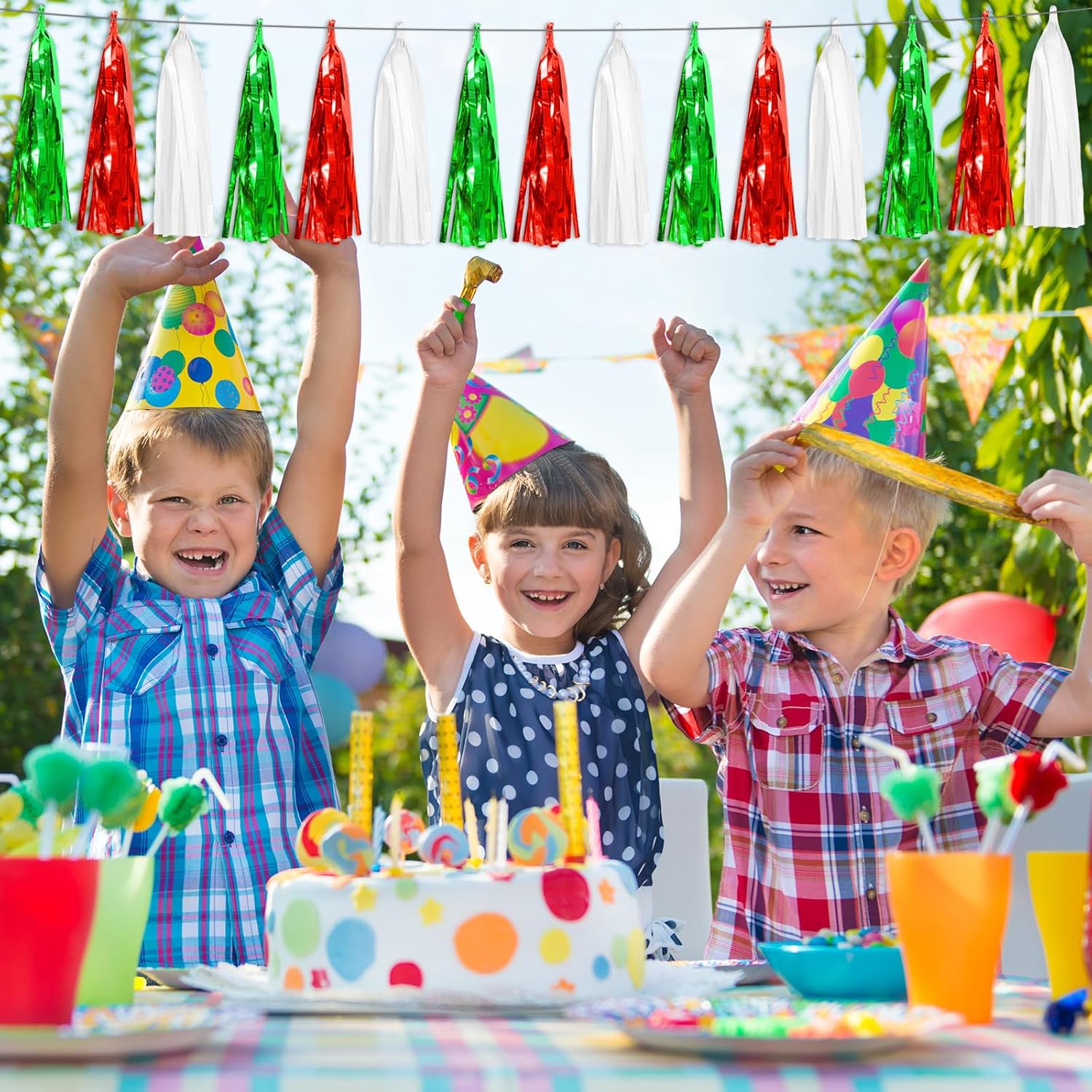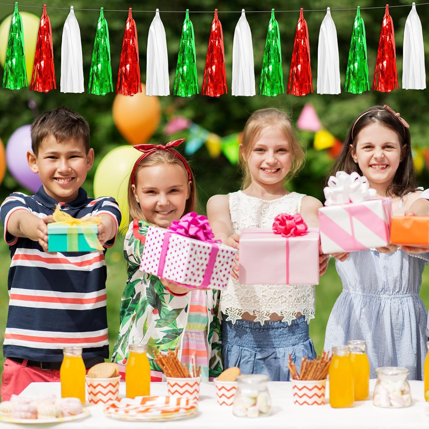 • 【Red Green White Party Supplies Set】: The total length of the Red Green White birthday tassels banner is 39.4 feet, divided into 4 strips, each 9.8 feet long. Each banner contains 15 tassels, and each tassel measures 14 inches, for birthday decorations many occasions, and so on