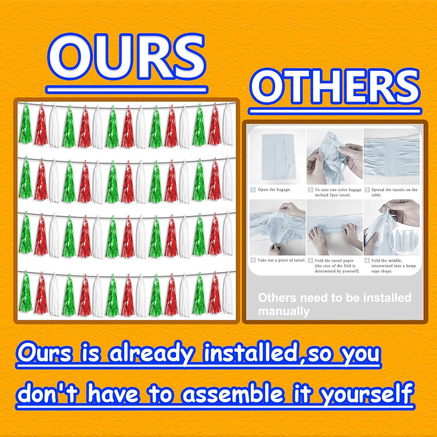 • 【Perfect Party Decoration】The Red Green White tinsel garlands are designed in a metallic Fringe, bright, and beautiful, at the same time, they shine in the sun, and these gorgeous tassel garlands create a wonderful backdrop or centerpiece for your party space. and bring you, your family, and your friend's good Visual effects. your party many emotional and touching moments where a lot of pictures will be taken and everybody will have a wonderful time together.