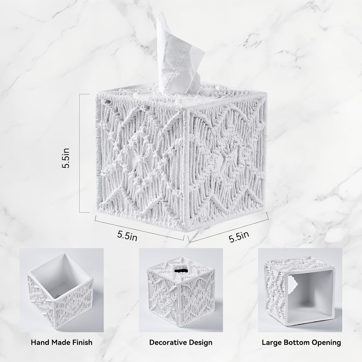 White Woven Macrame Boho Tissue Box Cover Square for Home Decor,Resin Heavy Woven Tissue Box Holder for Bathroom Kitchen Countertop,Bedroom, Vanity, Night Stand, Office Desk Top, Waterproof Durable