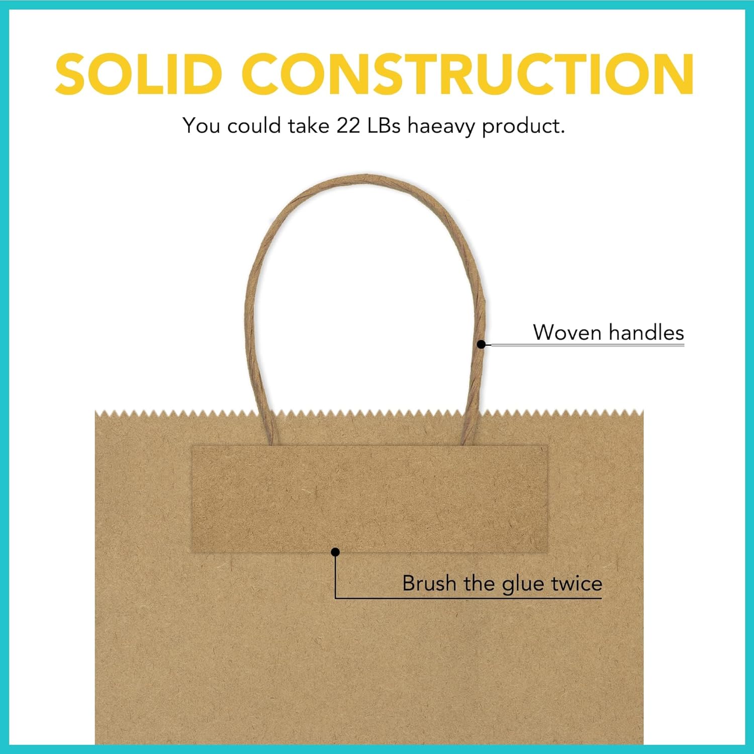 • STURDY AND DURABLE CONSTRUCTION - Halulu brown kraft paper gift bags have a square bottom and can stand up easily. Each bag is several mil. thick and will not tear or rip easily. These kraft paper bags can hold up to several lbs each. The reinforced bottom also provides extra support while you shop or carry items, ensuring that the contents will stay safe not fall through, unlike other flimsy bags. The strong braided handles give an upscale feel while making it easy to carry.