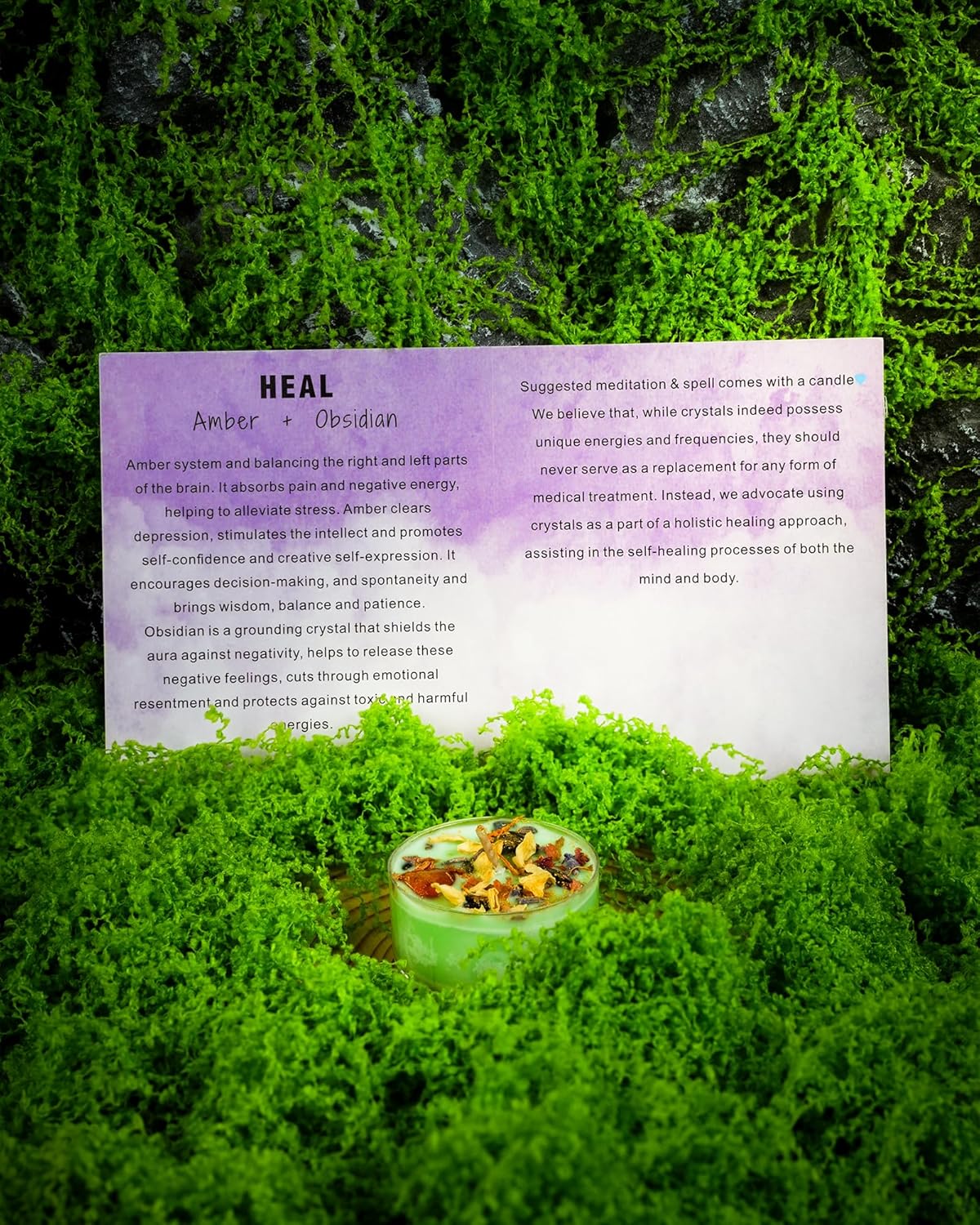 • Tea Lights 8 Candle Set: obsidian + amber + dried petals. Amber systems and balances the left and right parts of the brain. It absorbs pain and negative energy and helps relieve stress. It encourages decision making and spontaneity and brings wisdom, balance and patience.