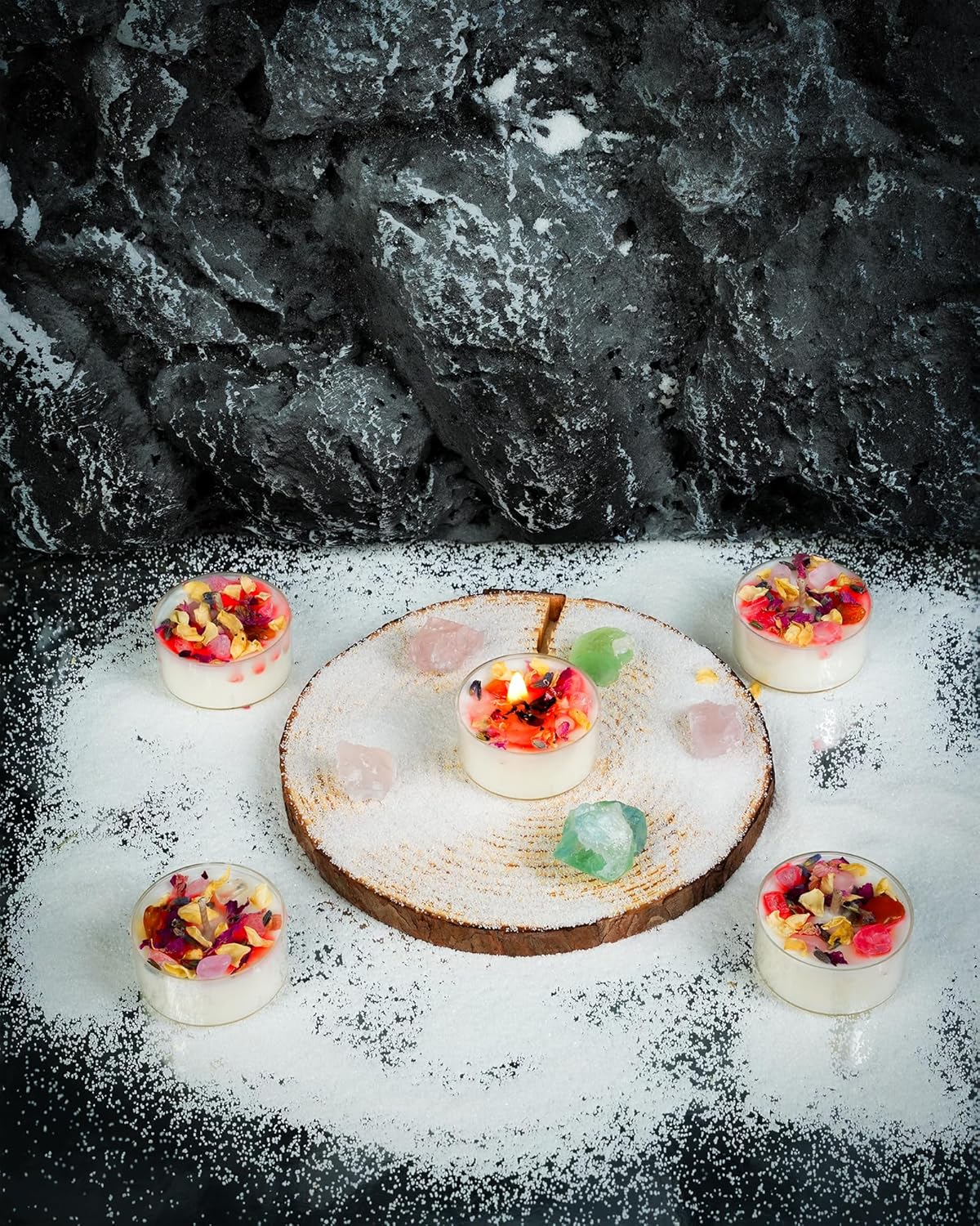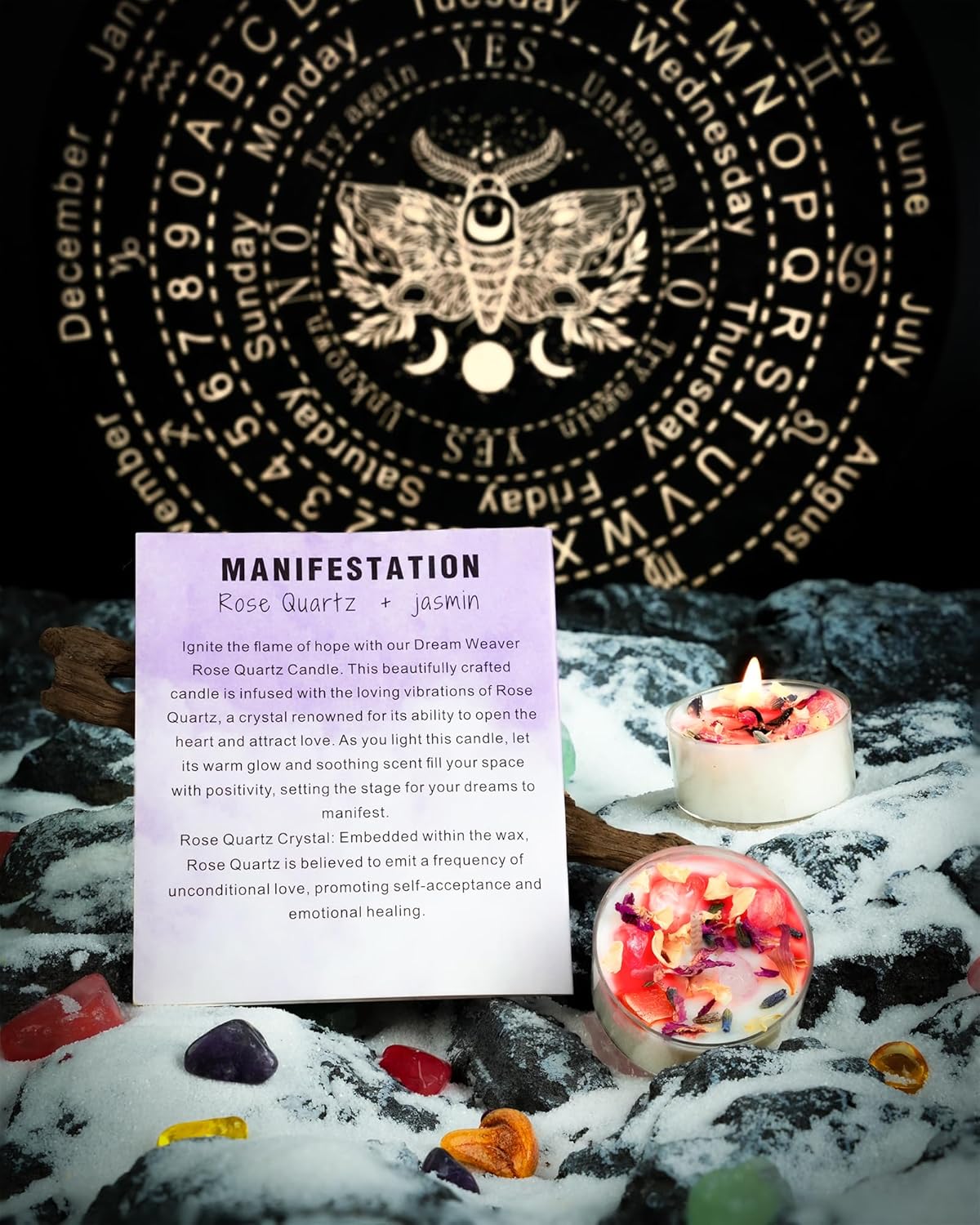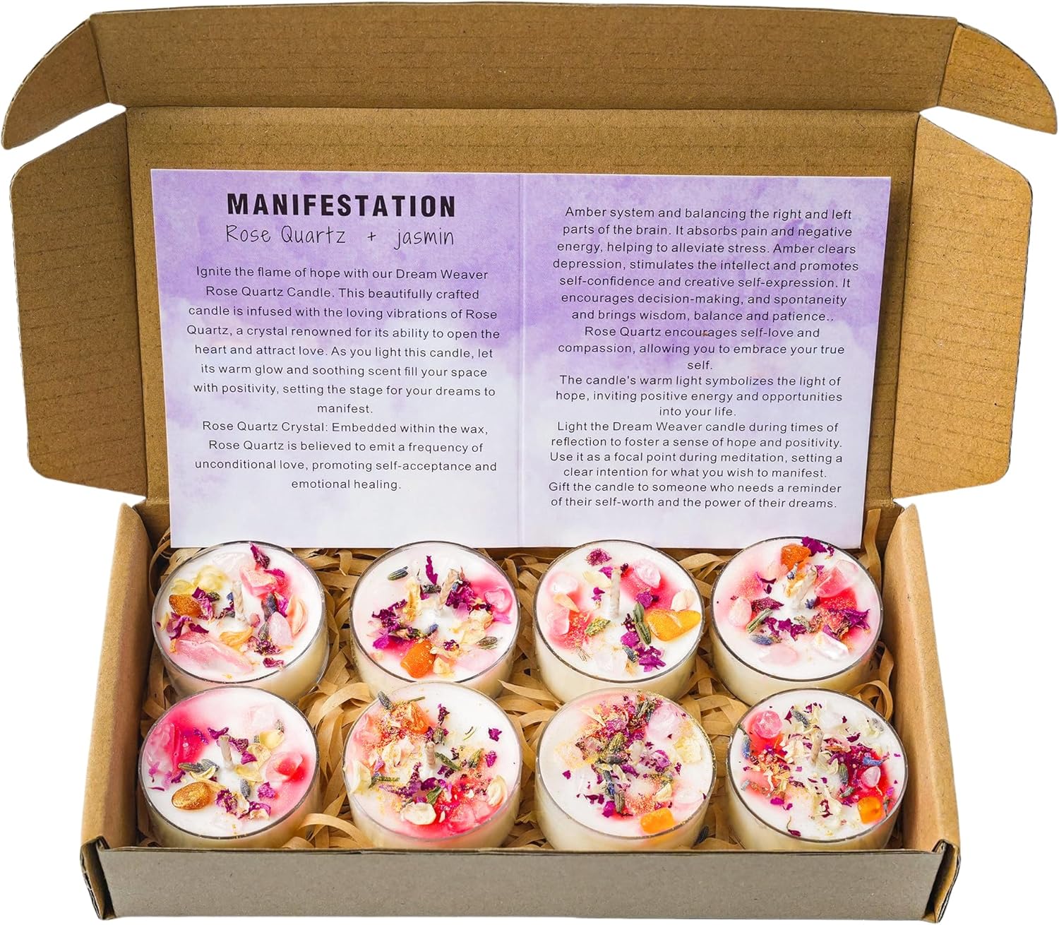 • Tea Lights 8 Candle Set: rose + quartzite + jasmine + lavender set. Fulfill all your wishes with rose quartz infused 11:11 manifesting candles and a great gift for candle lovers!
